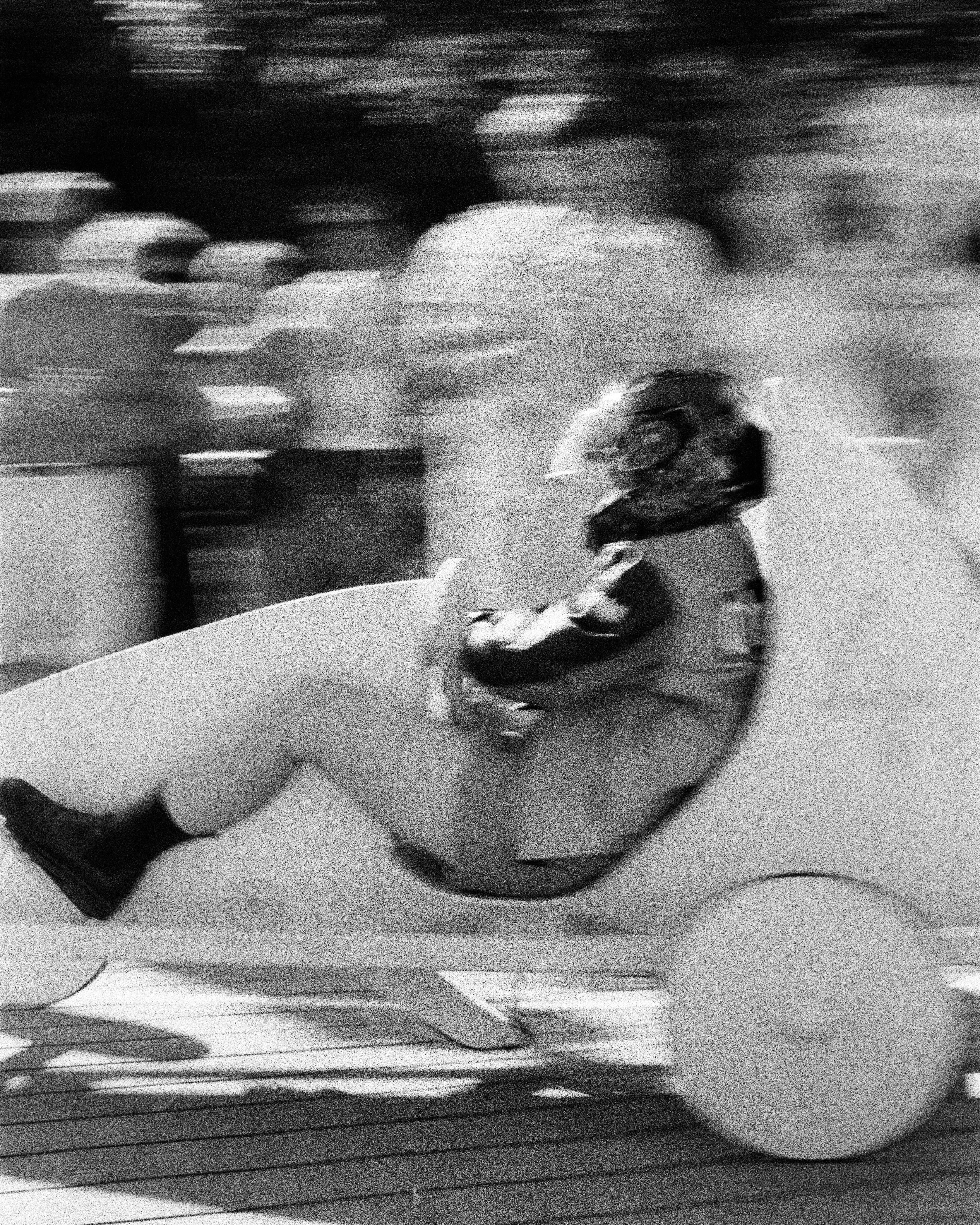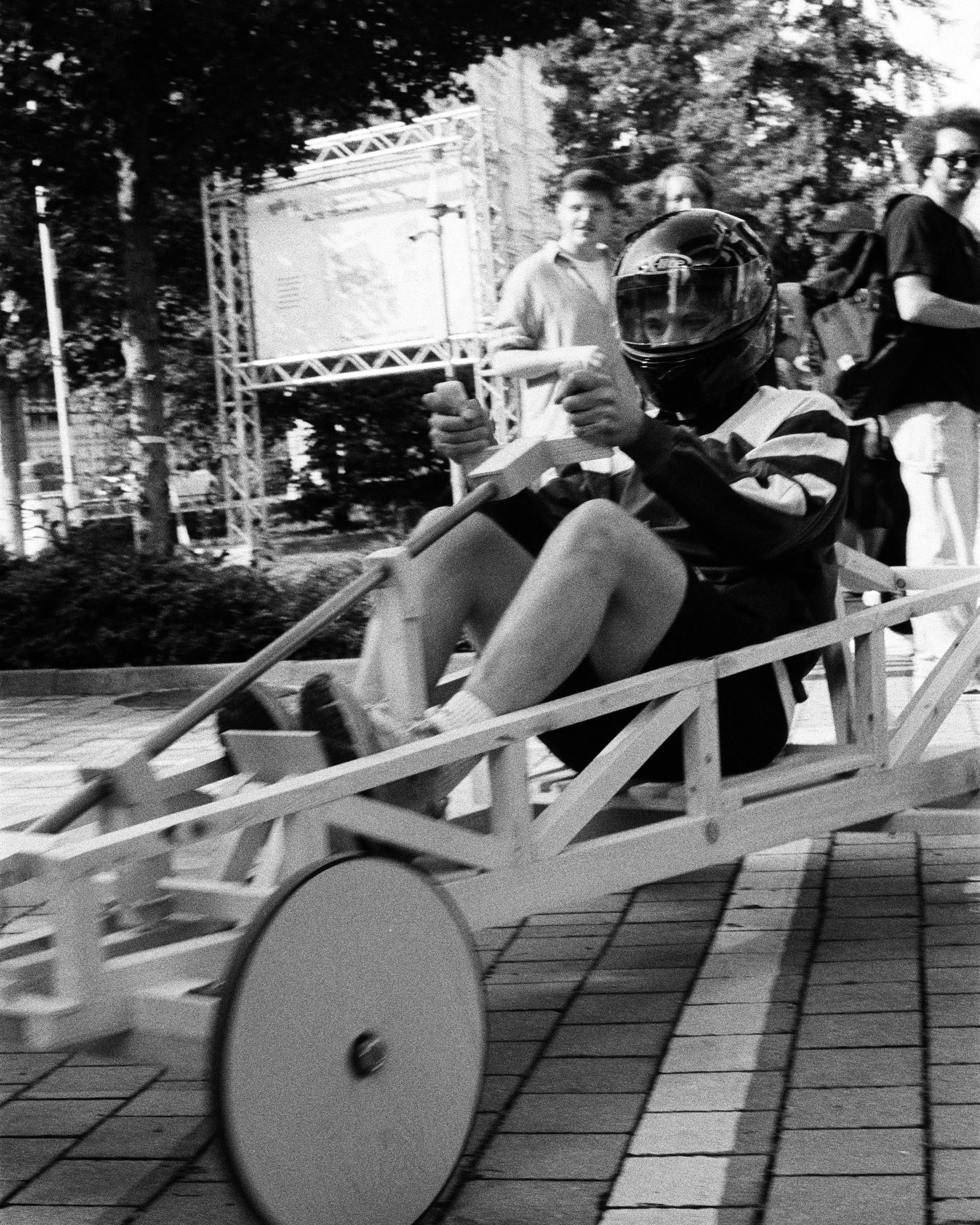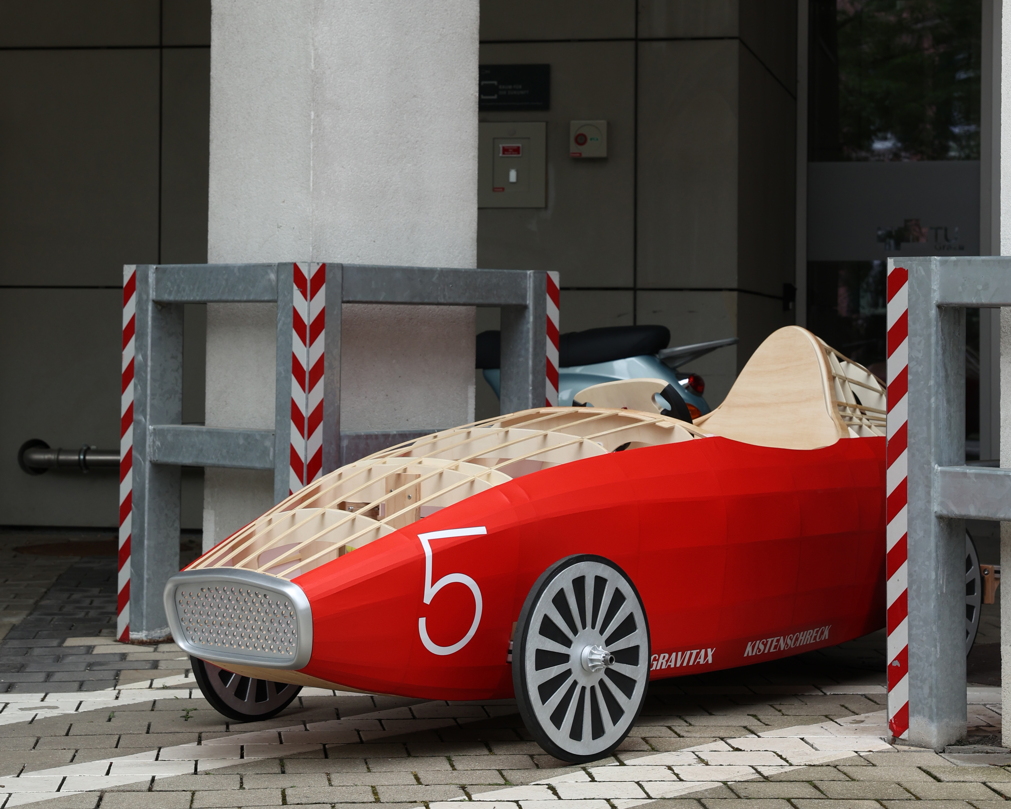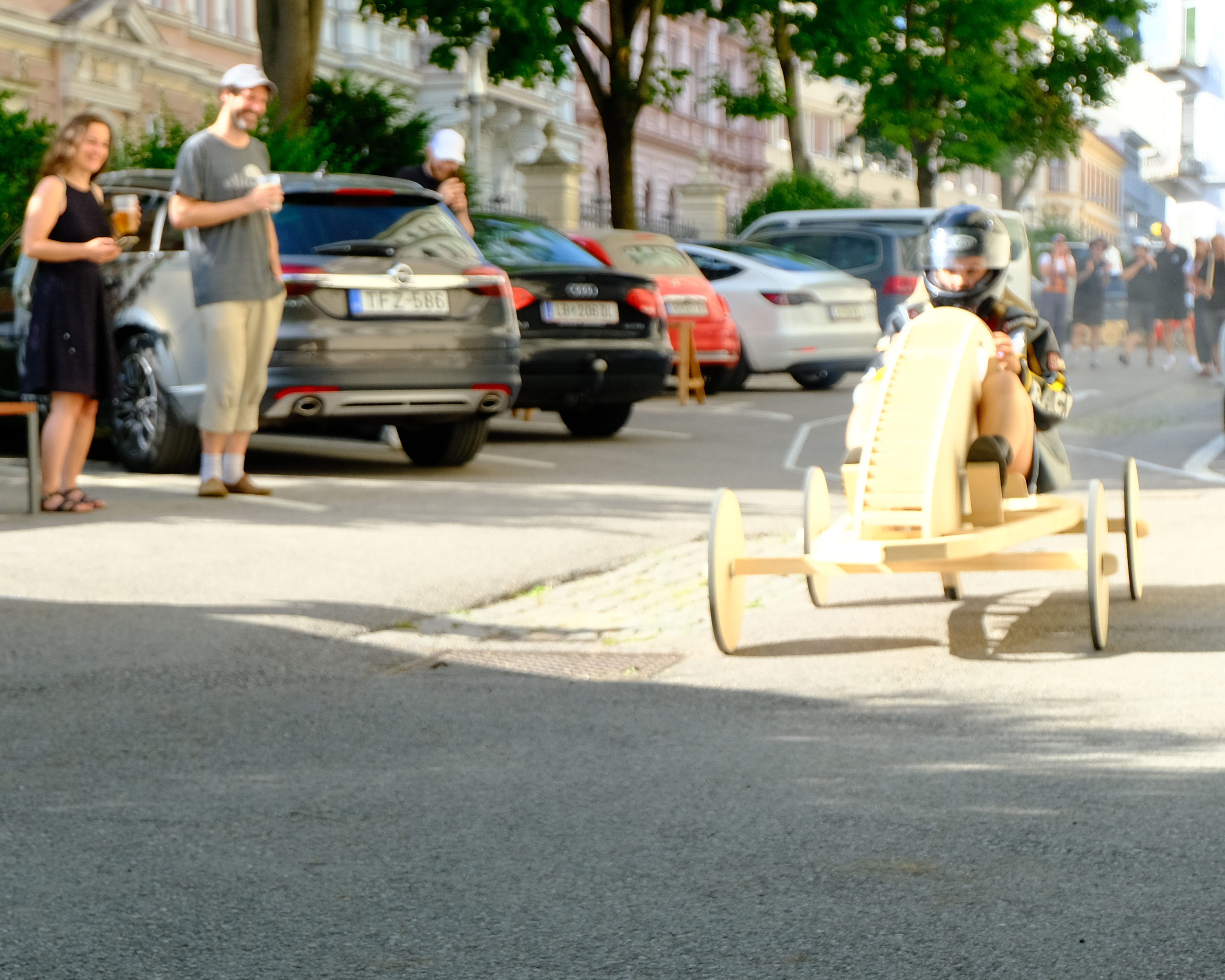 Nachhaltigkeit, Klimawandel, ökologischer Fußabdruck, grüner Strom alles Schlagwörter der jetzigen Zeit, wir respektieren das und beschleunigen, mit unserem antriebslosen Gefährt auf einer abschüssigen Strecke durch die Hangabtriebskraft, ohne Emissionen.