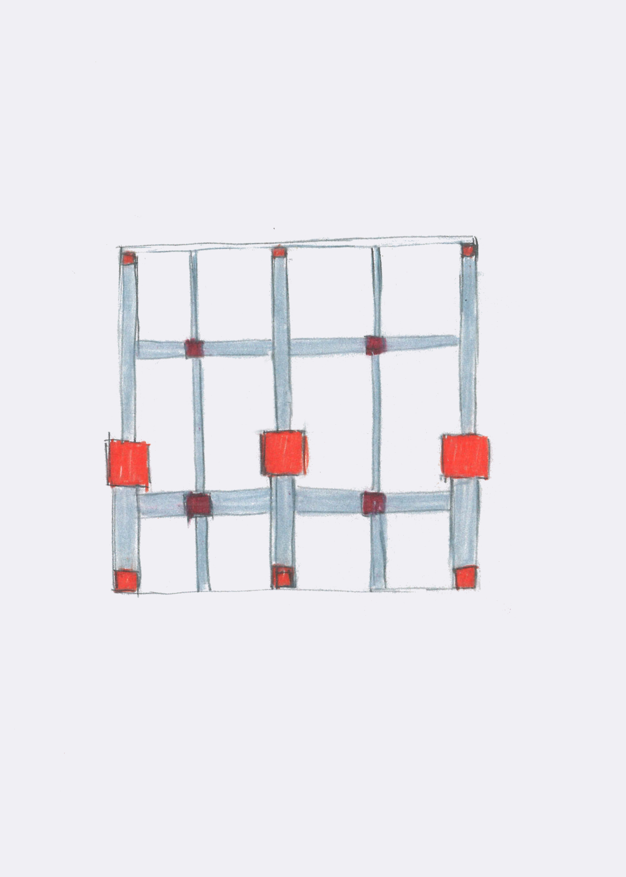 Als Grundlage dient uns allen das gleiche Feld. Es geht uns weniger um die Großform des Hauses als um die Beziehungen seiner einzelnen Teile zueinander. Es gibt eine Andeutung von Geschossigkeit, mehr aber nicht. Das tatsächliche Dahinter ist uns so gleichgültig wie der Boden unter den Füßen.