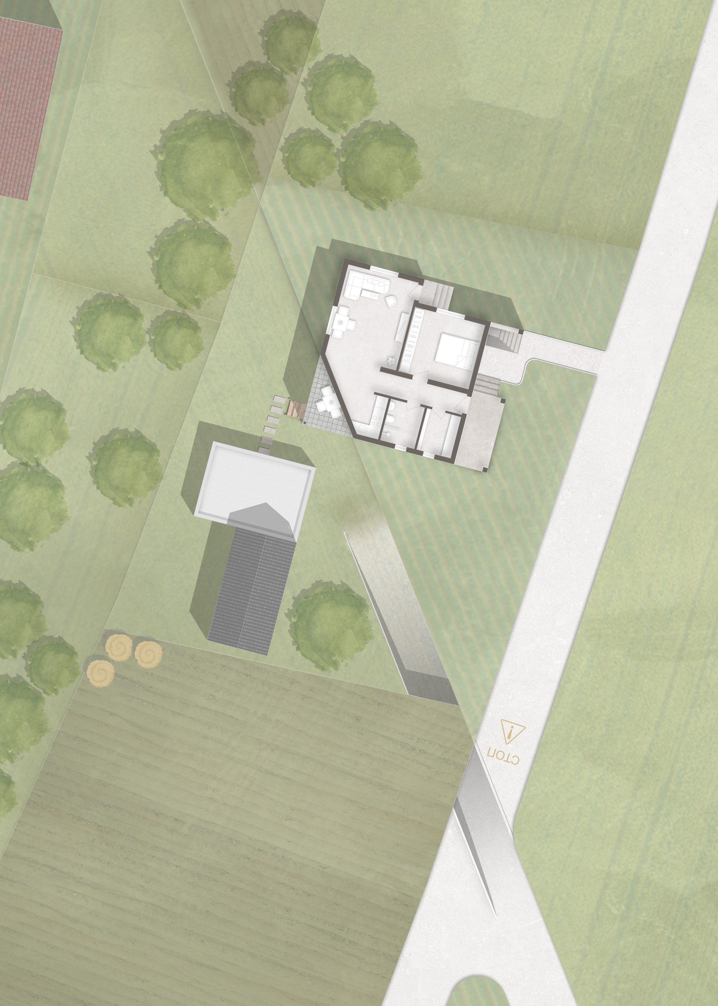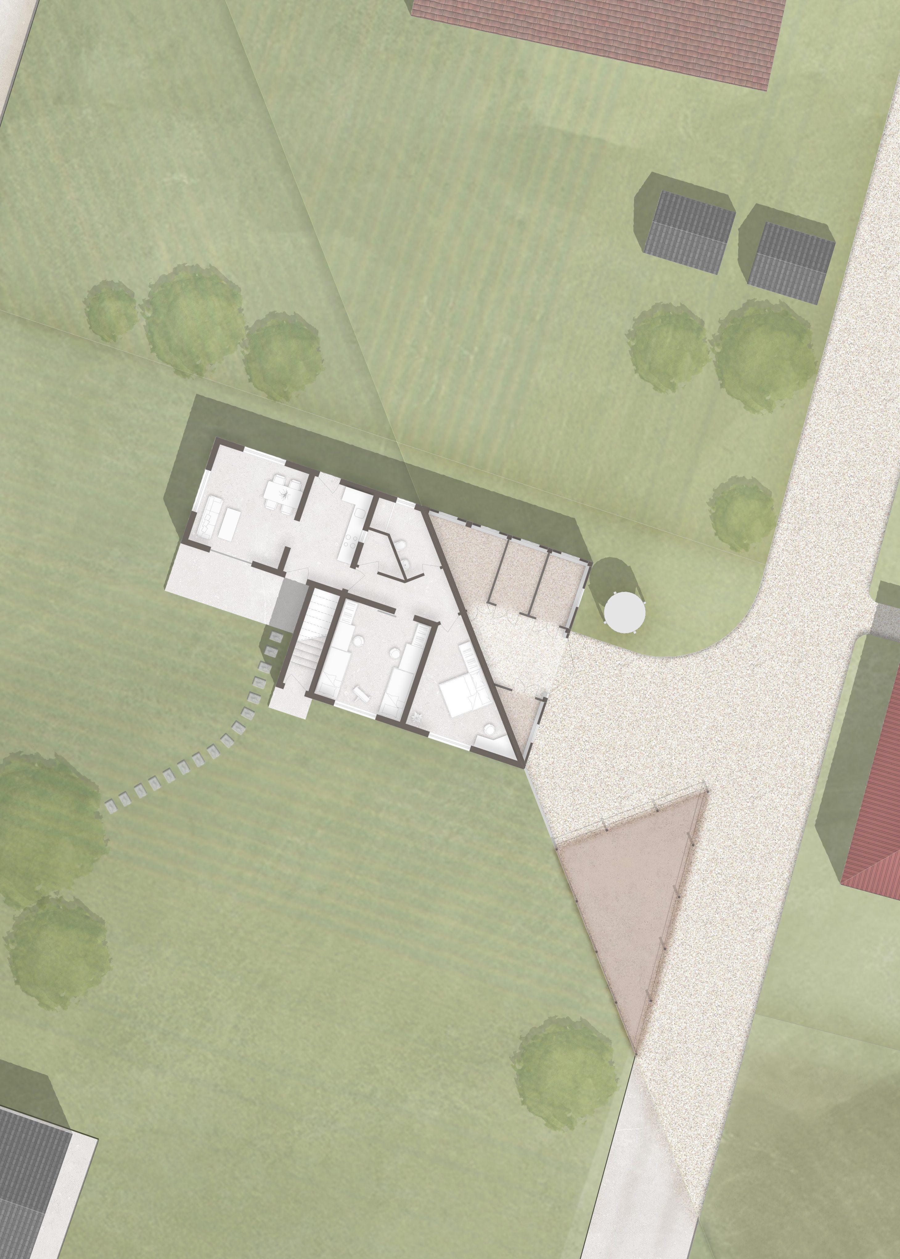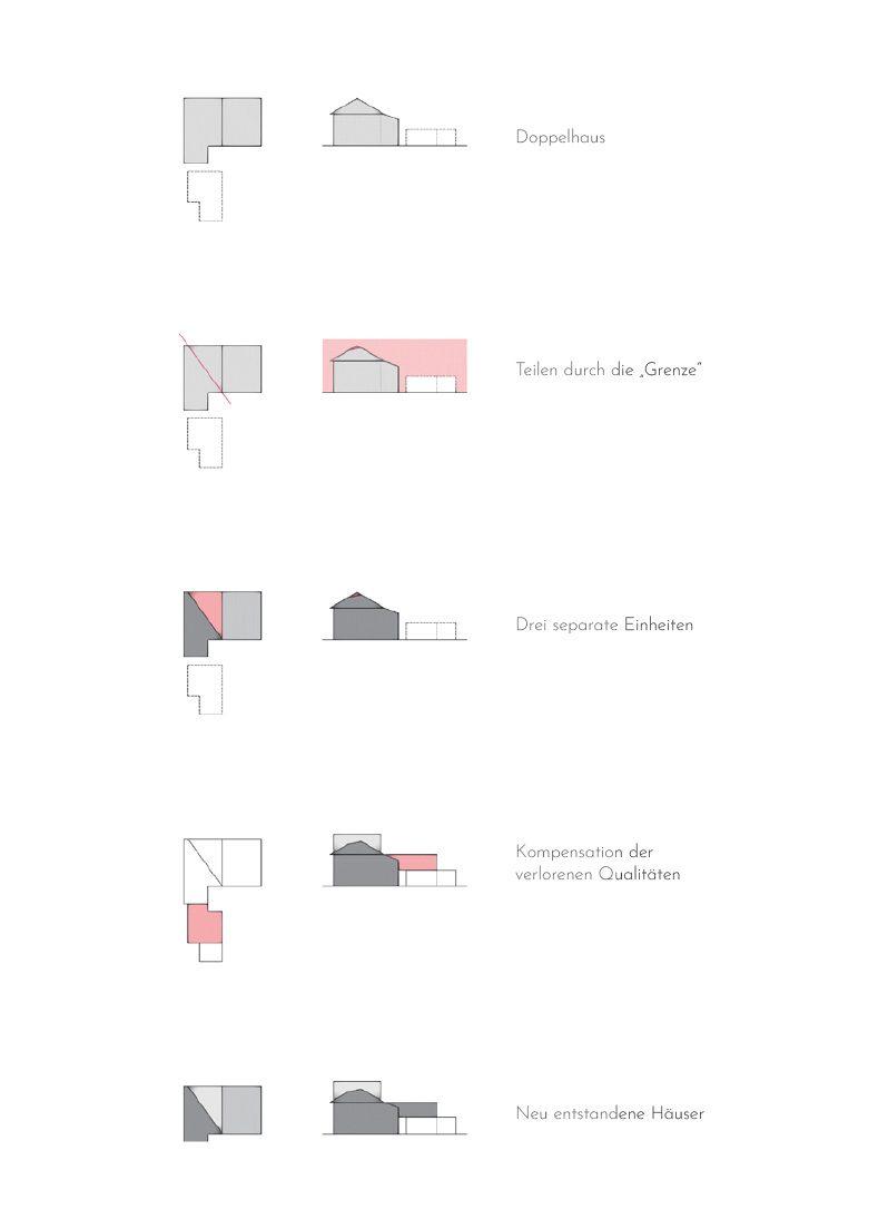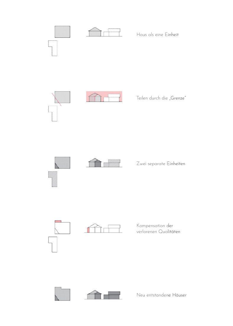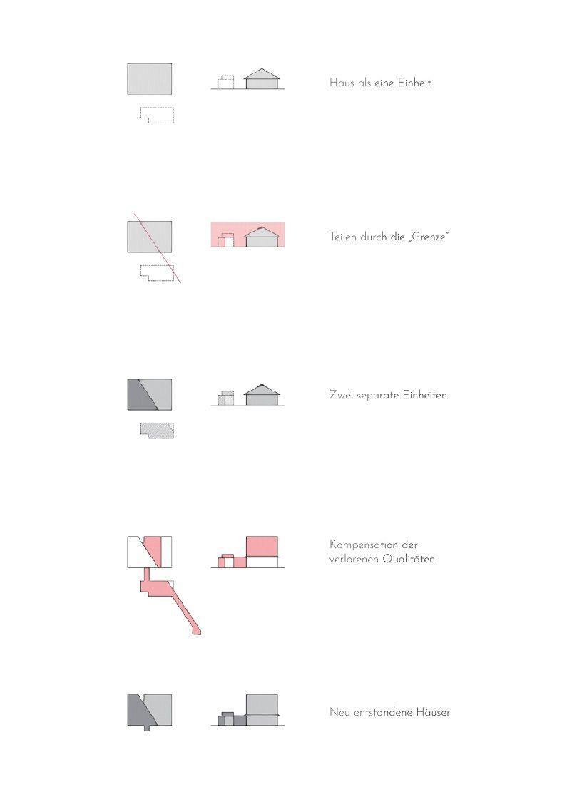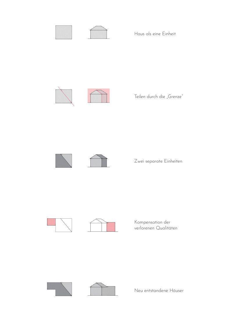 Was würde in einer Siedlung passieren, in der die Linie nicht an die bestehende Struktur angepasst ist, sondern rücksichtslos alles auf ihrem Weg durchschneidet, unter der Annahme, dass beide Seiten strikt unabhängig voneinander existieren, funktionieren und agieren? Wenn ich genauer darüber nachdenke, werden sogar die Häuser zu Opfern dieser Linie... Dennoch sollte ein solches Haus, obwohl es von der Linie betroffen ist, seine Qualität bewahren. Aber wie?