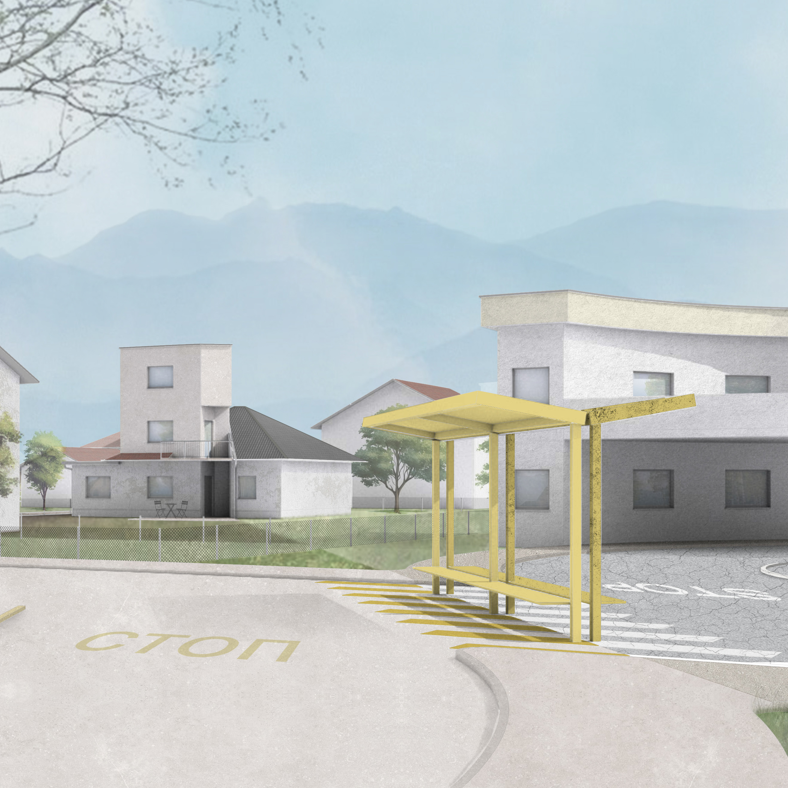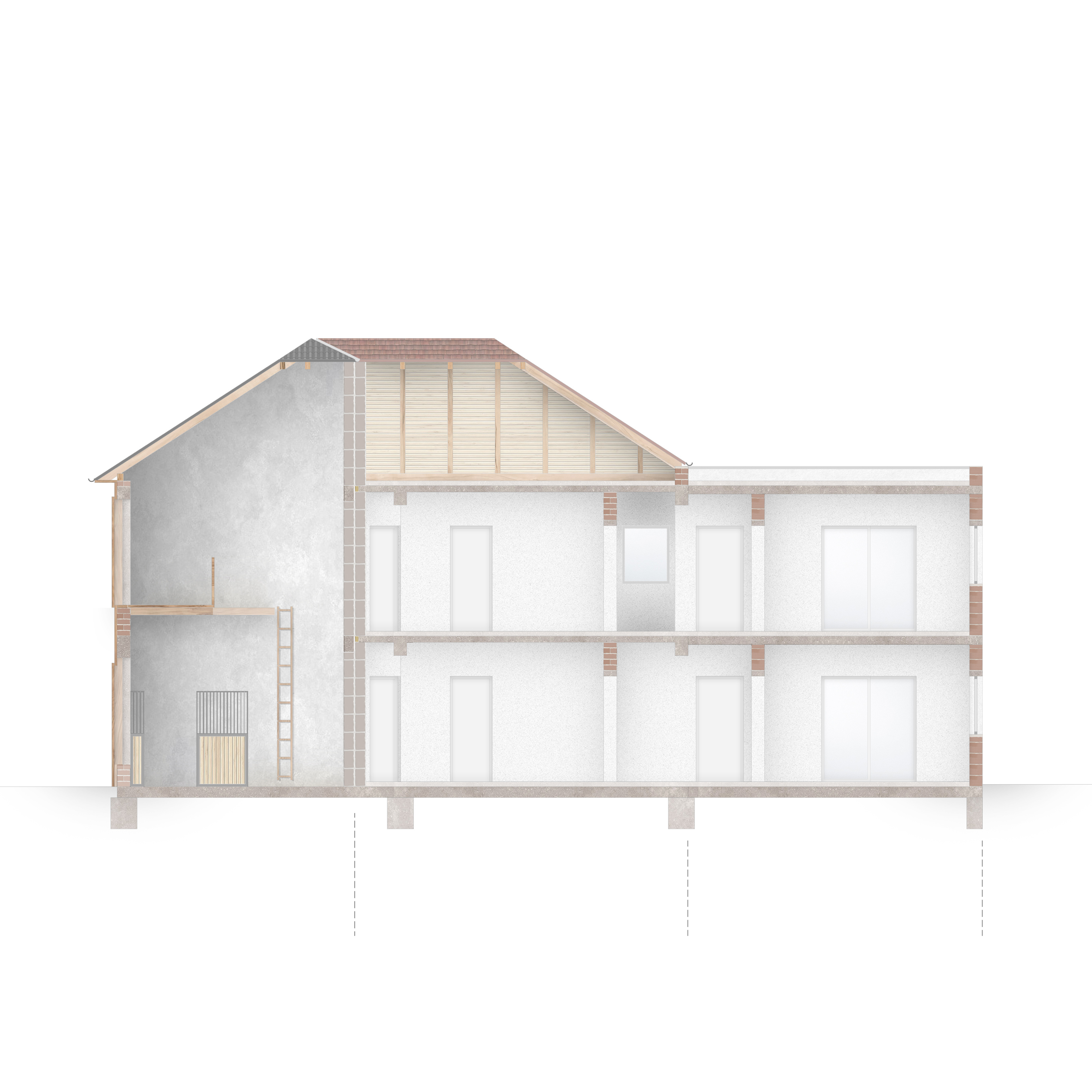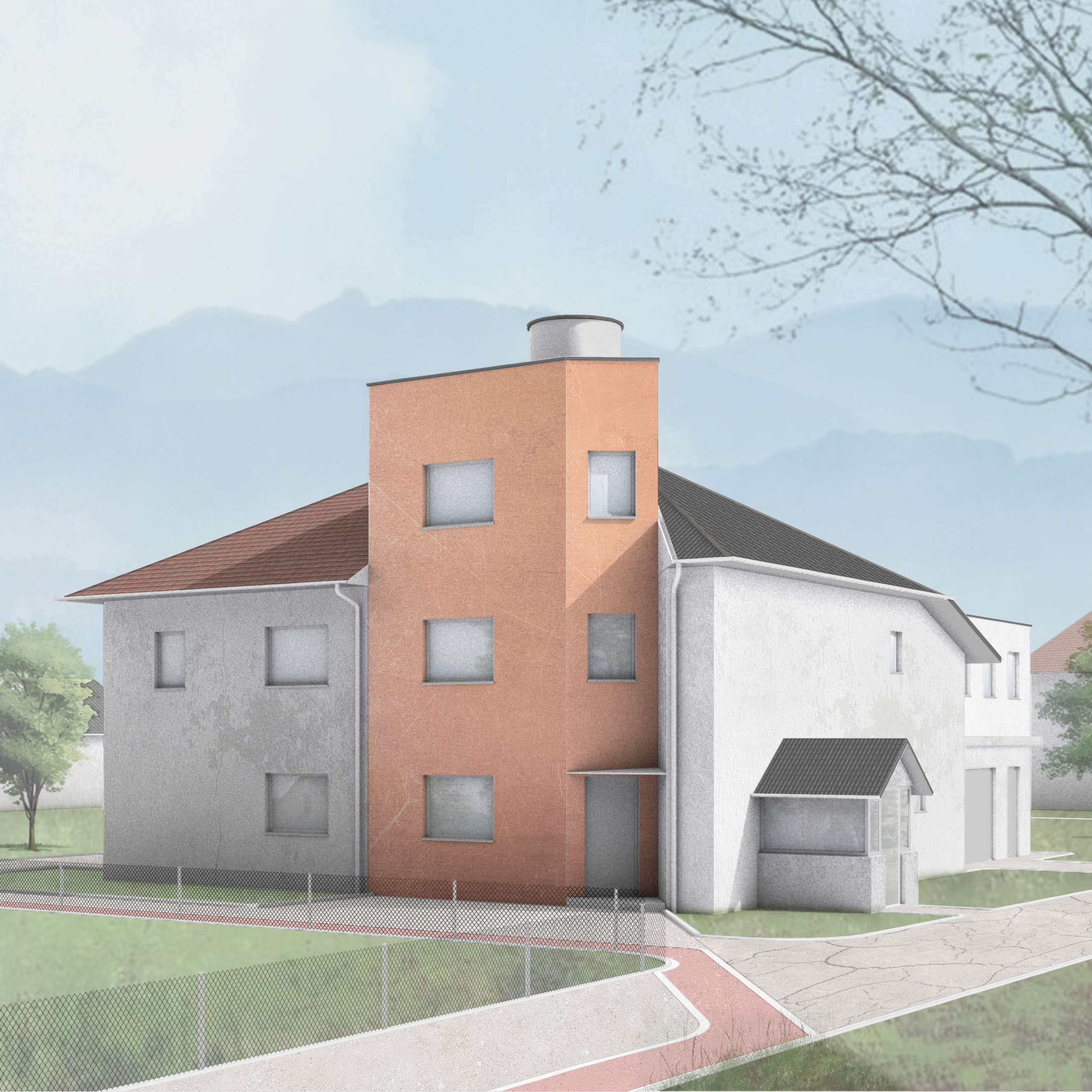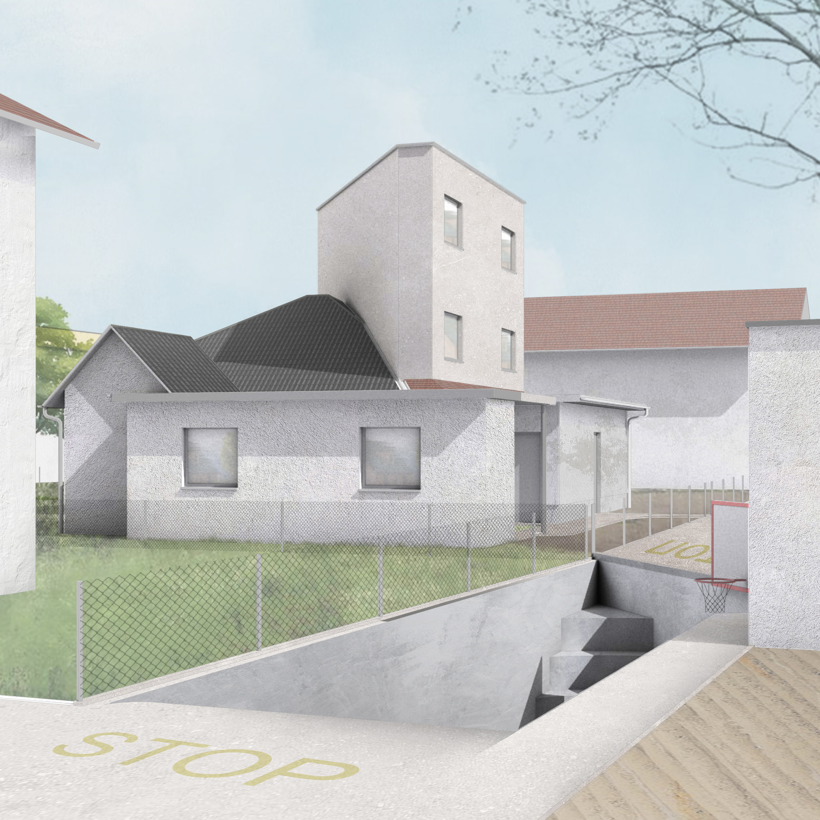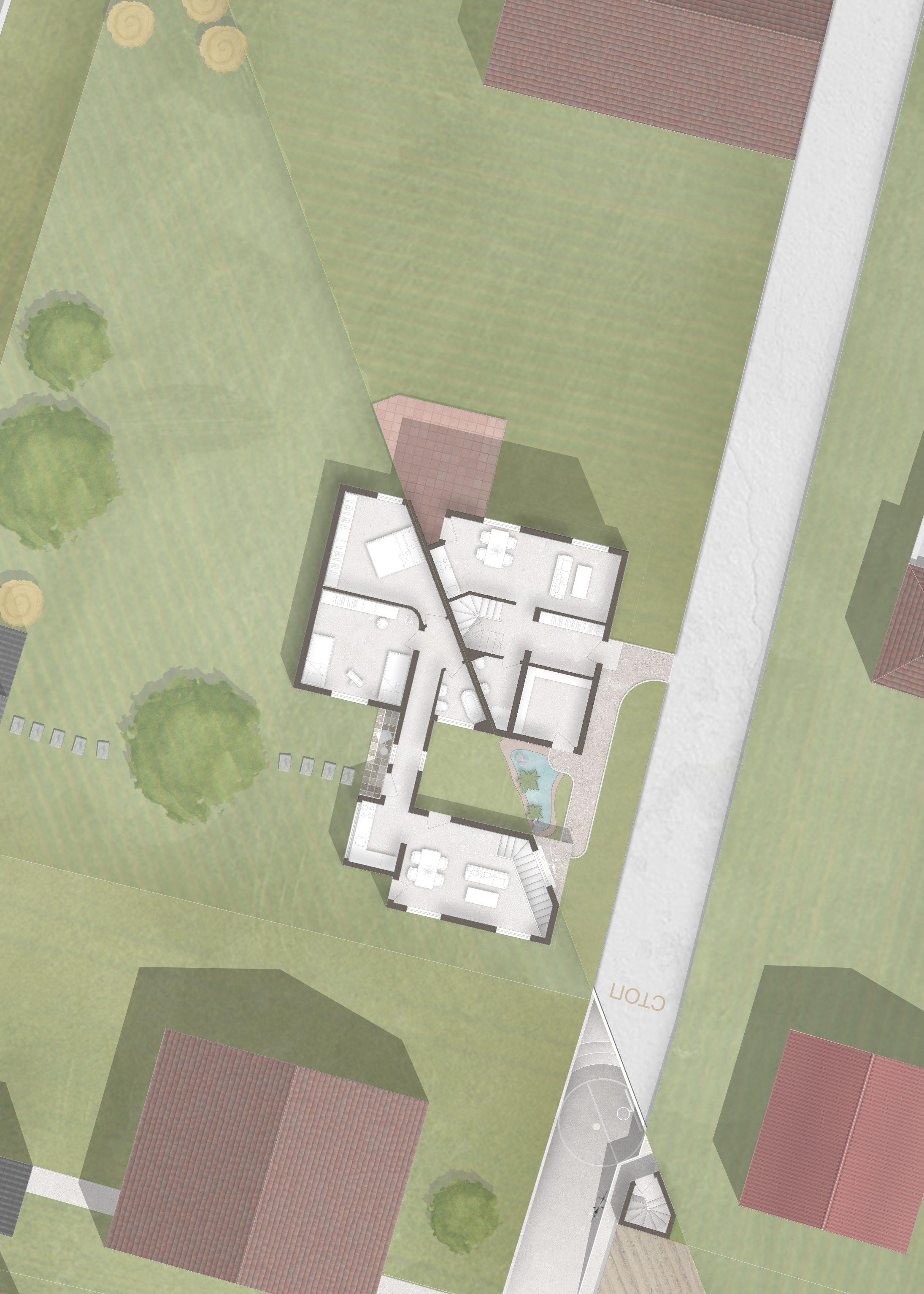 Was würde in einer Siedlung passieren, in der die Linie nicht an die bestehende Struktur angepasst ist, sondern rücksichtslos alles auf ihrem Weg durchschneidet, unter der Annahme, dass beide Seiten strikt unabhängig voneinander existieren, funktionieren und agieren? Wenn ich genauer darüber nachdenke, werden sogar die Häuser zu Opfern dieser Linie... Dennoch sollte ein solches Haus, obwohl es von der Linie betroffen ist, seine Qualität bewahren. Aber wie?