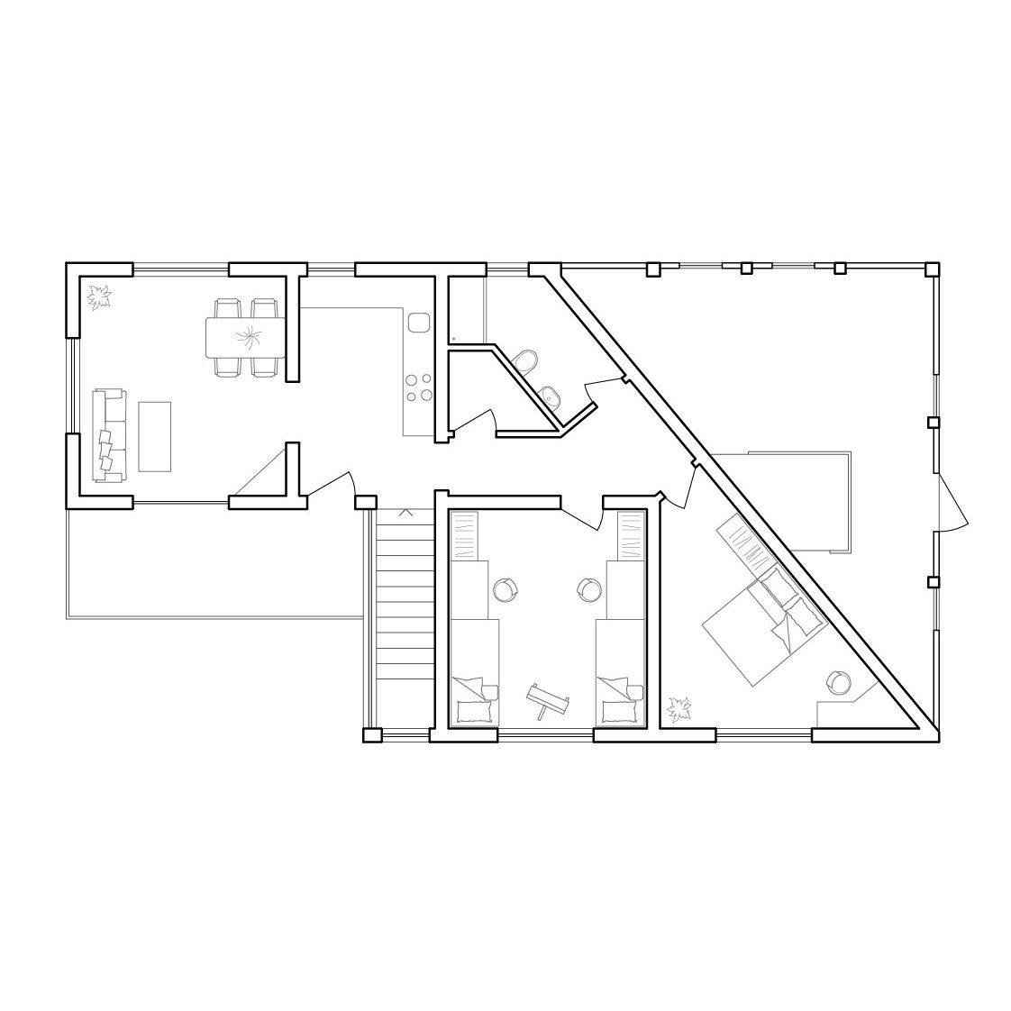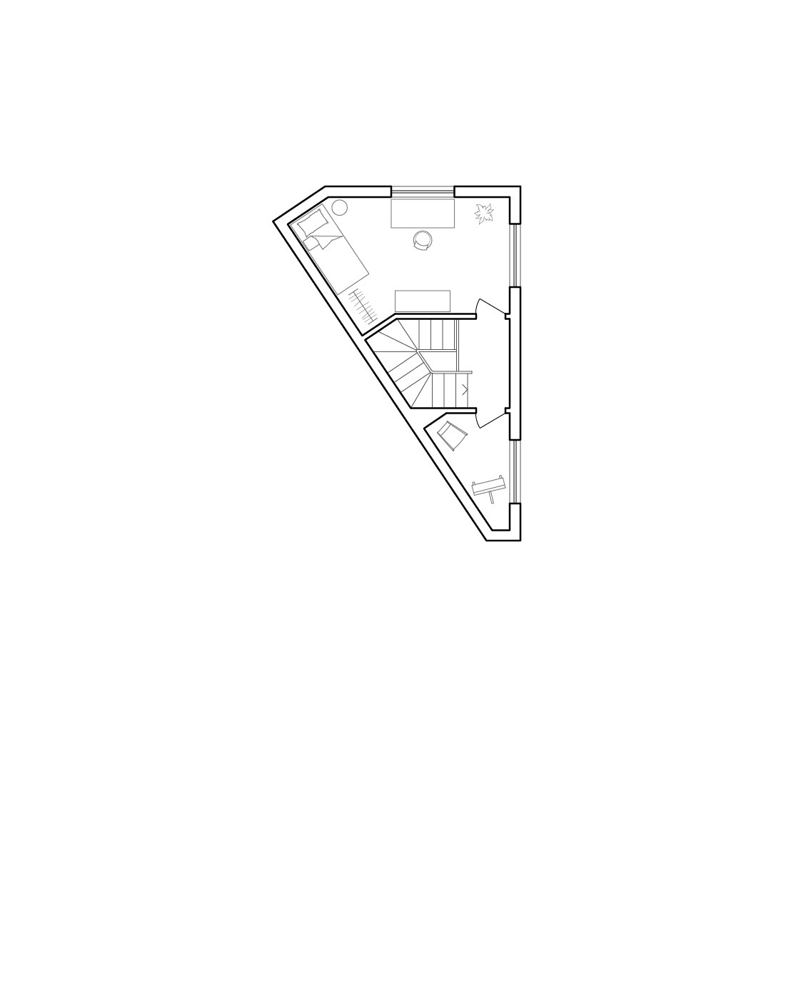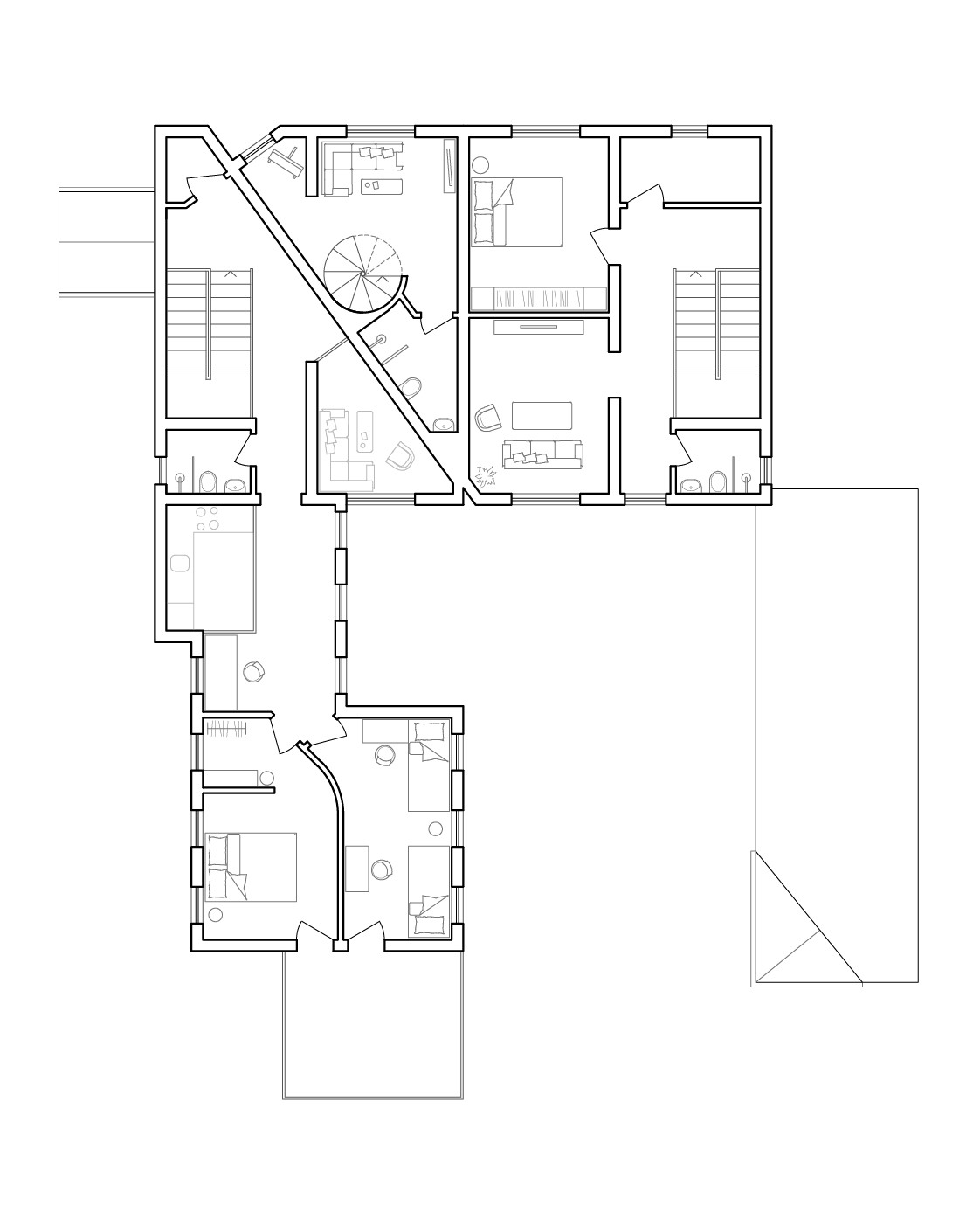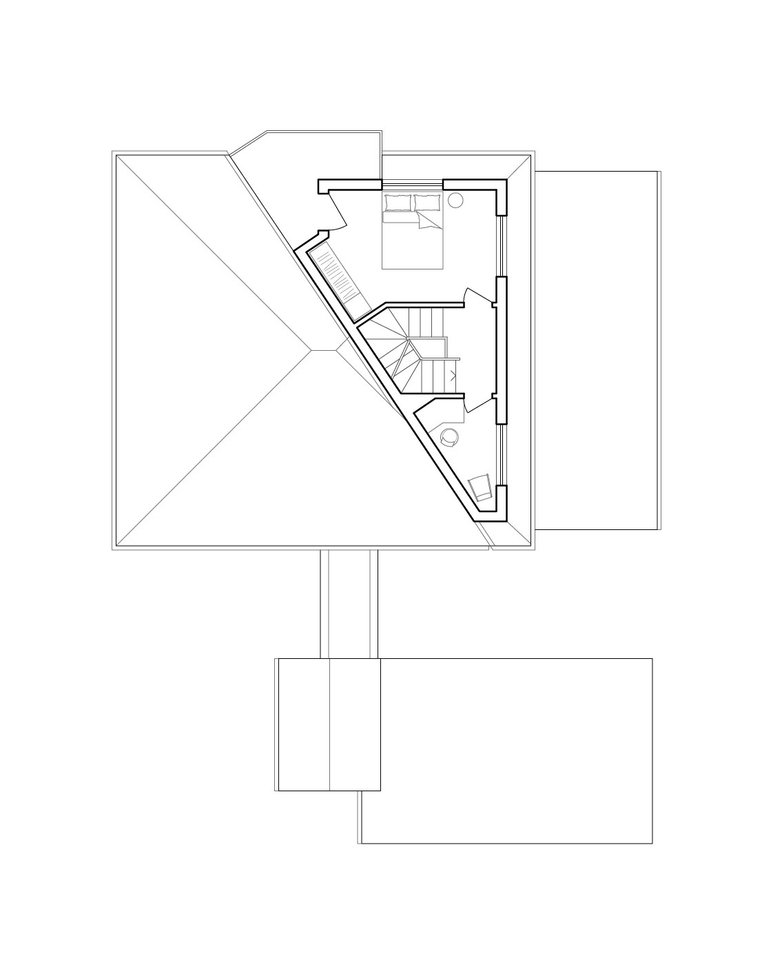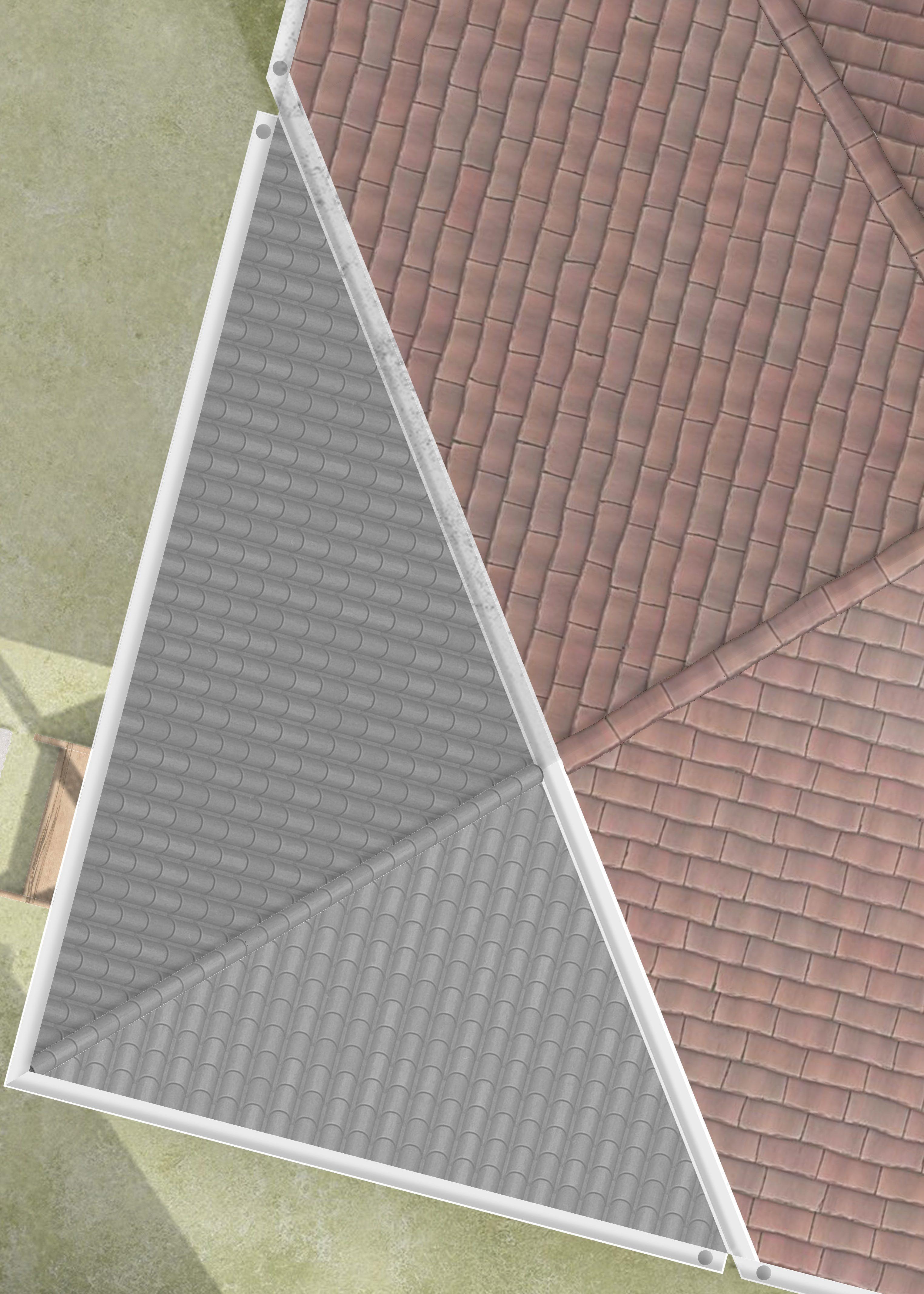 Was würde in einer Siedlung passieren, in der die Linie nicht an die bestehende Struktur angepasst ist, sondern rücksichtslos alles auf ihrem Weg durchschneidet, unter der Annahme, dass beide Seiten strikt unabhängig voneinander existieren, funktionieren und agieren? Wenn ich genauer darüber nachdenke, werden sogar die Häuser zu Opfern dieser Linie... Dennoch sollte ein solches Haus, obwohl es von der Linie betroffen ist, seine Qualität bewahren. Aber wie?