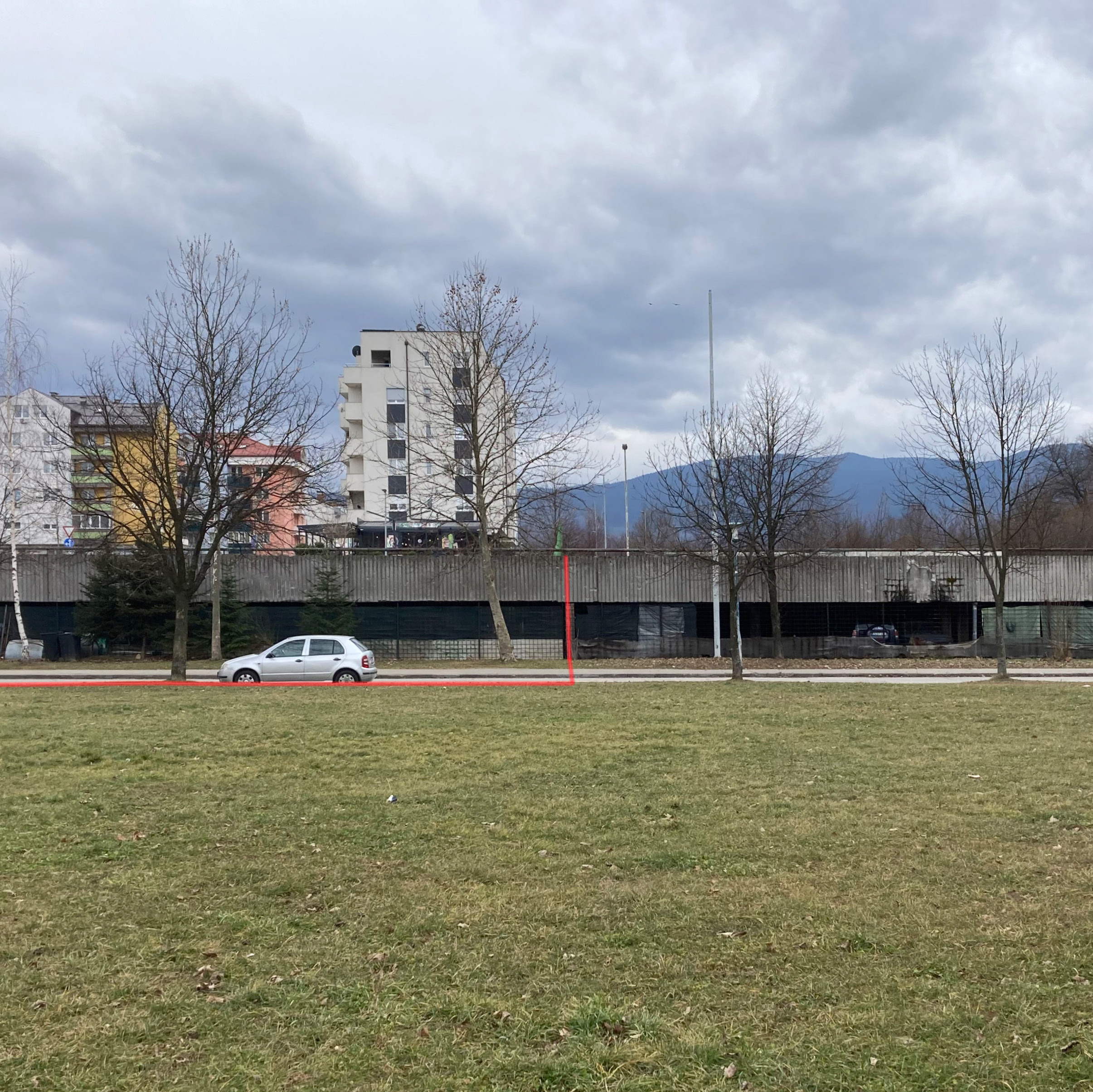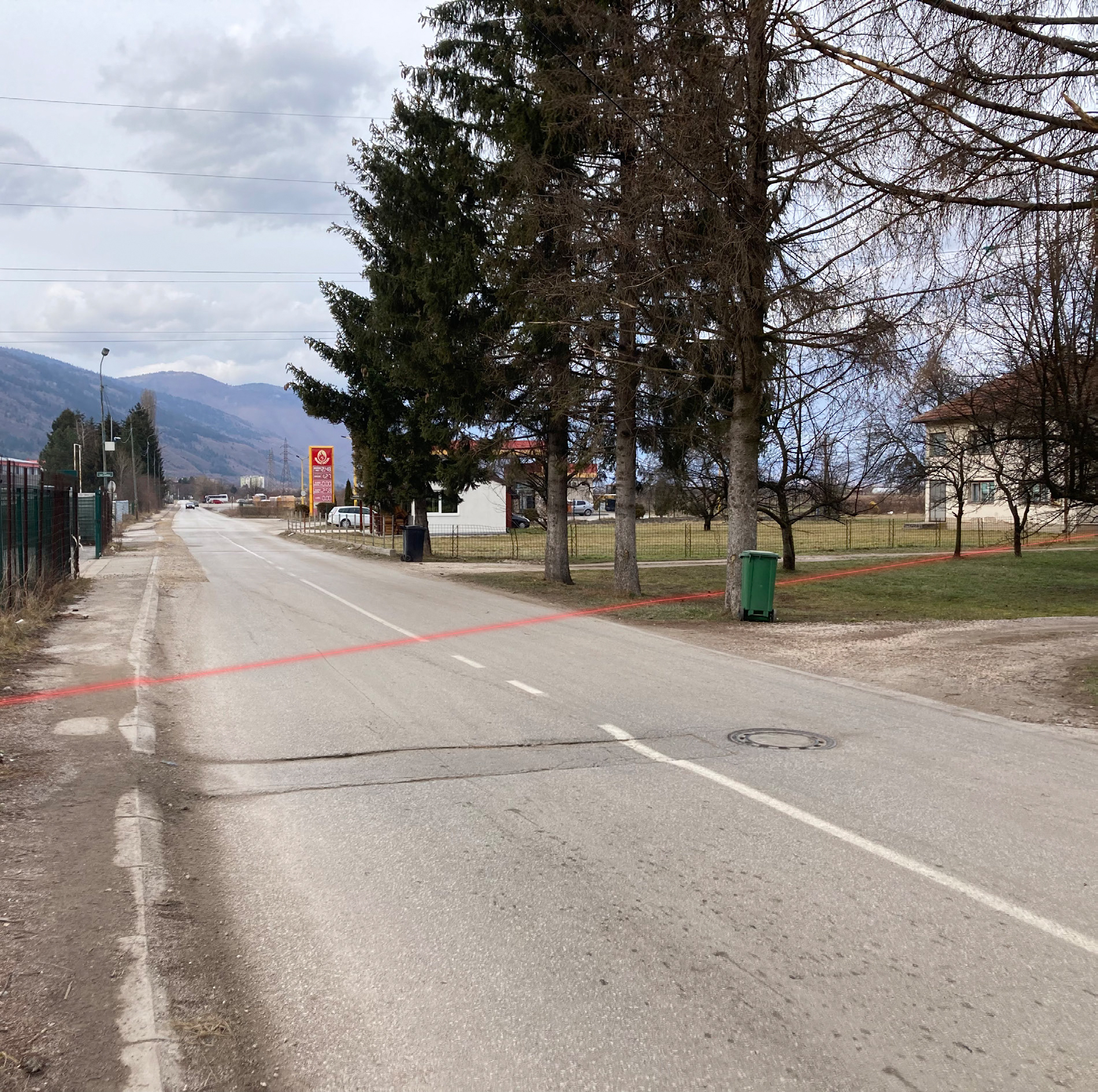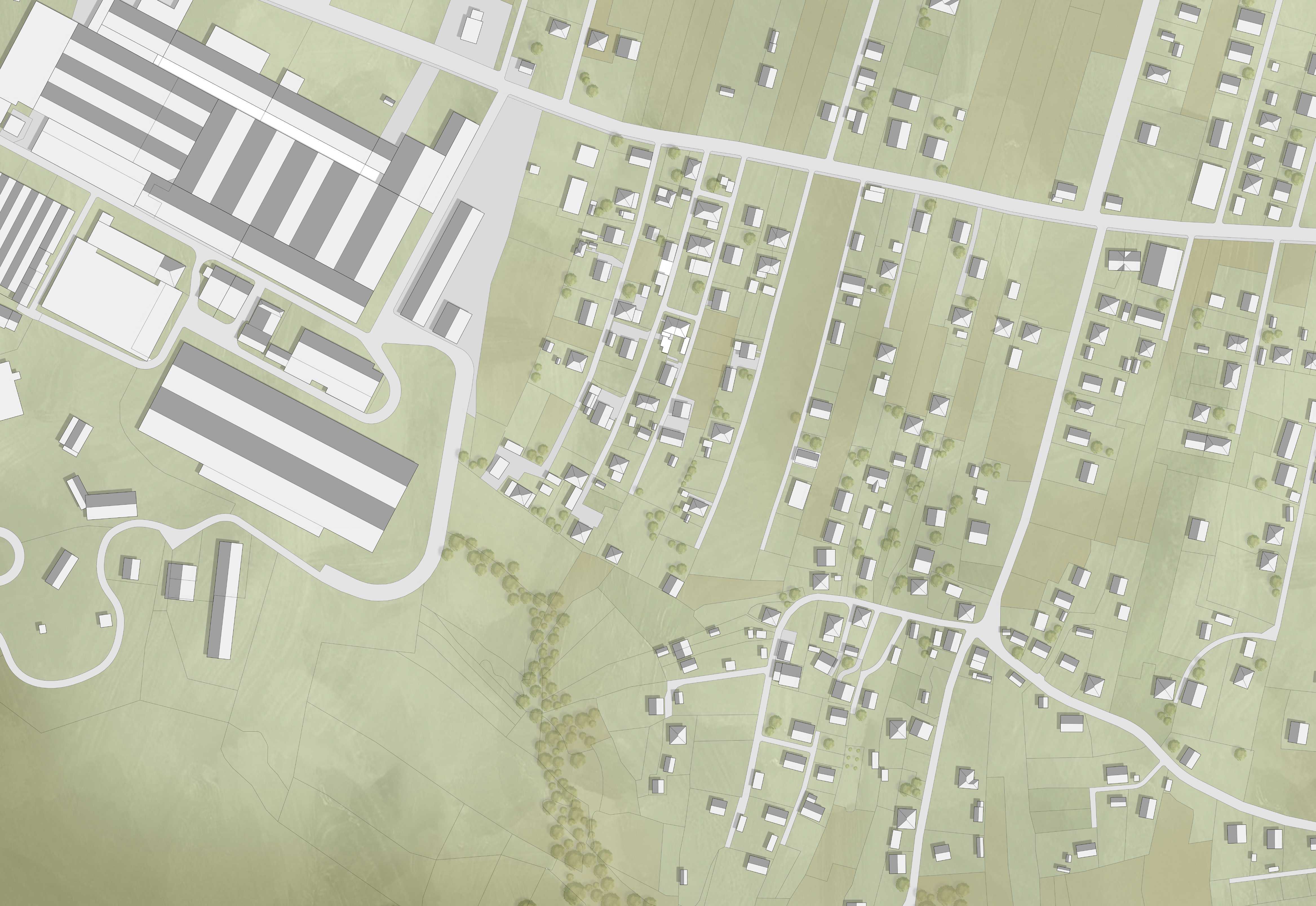 Auf der anderen Seite, im ländlichen Teil der Stadt, passt sich die Linie nicht der bestehenden Struktur an, sondern verläuft willkürlich durch Siedlungen, Häuser, Gärten und Straßen...