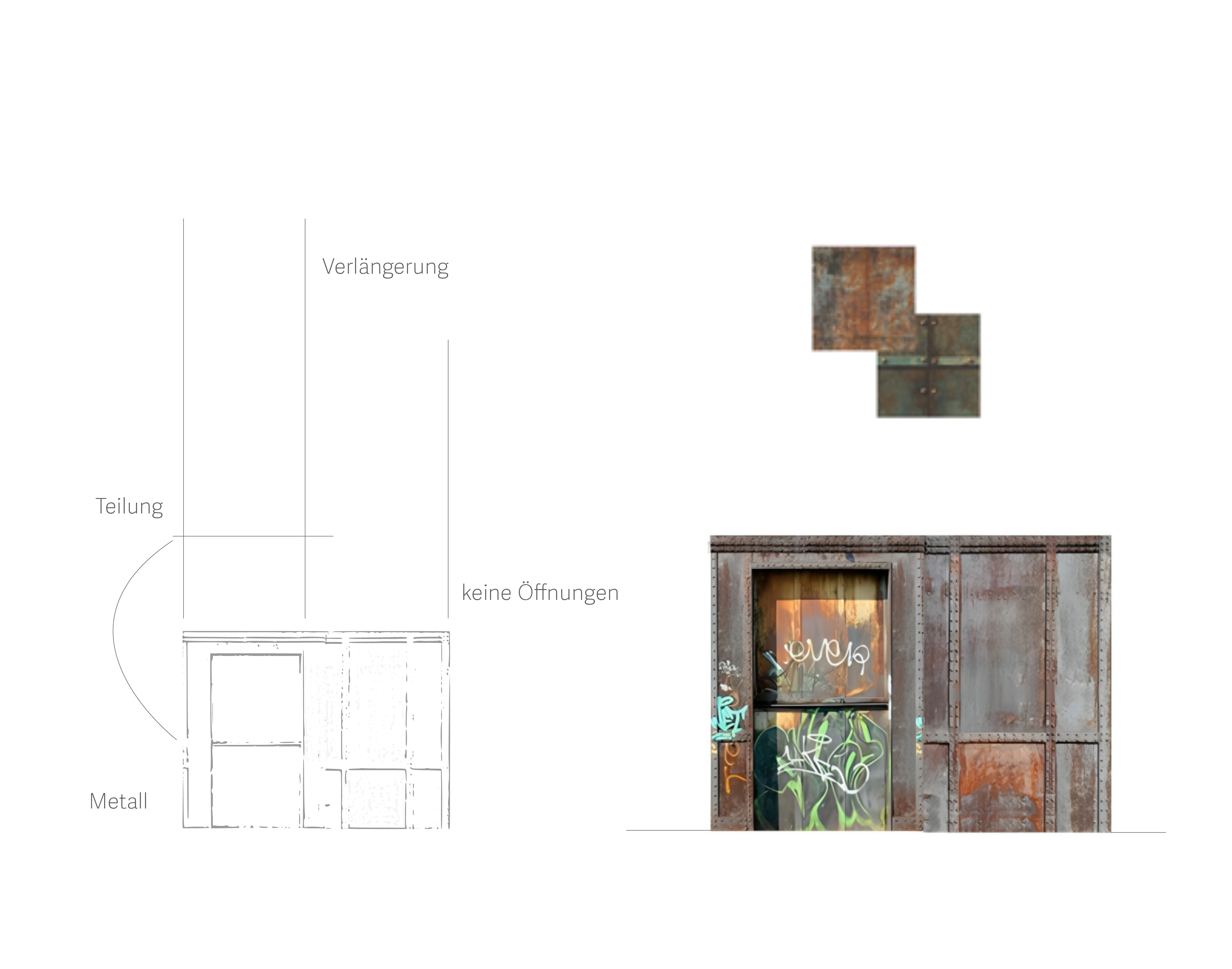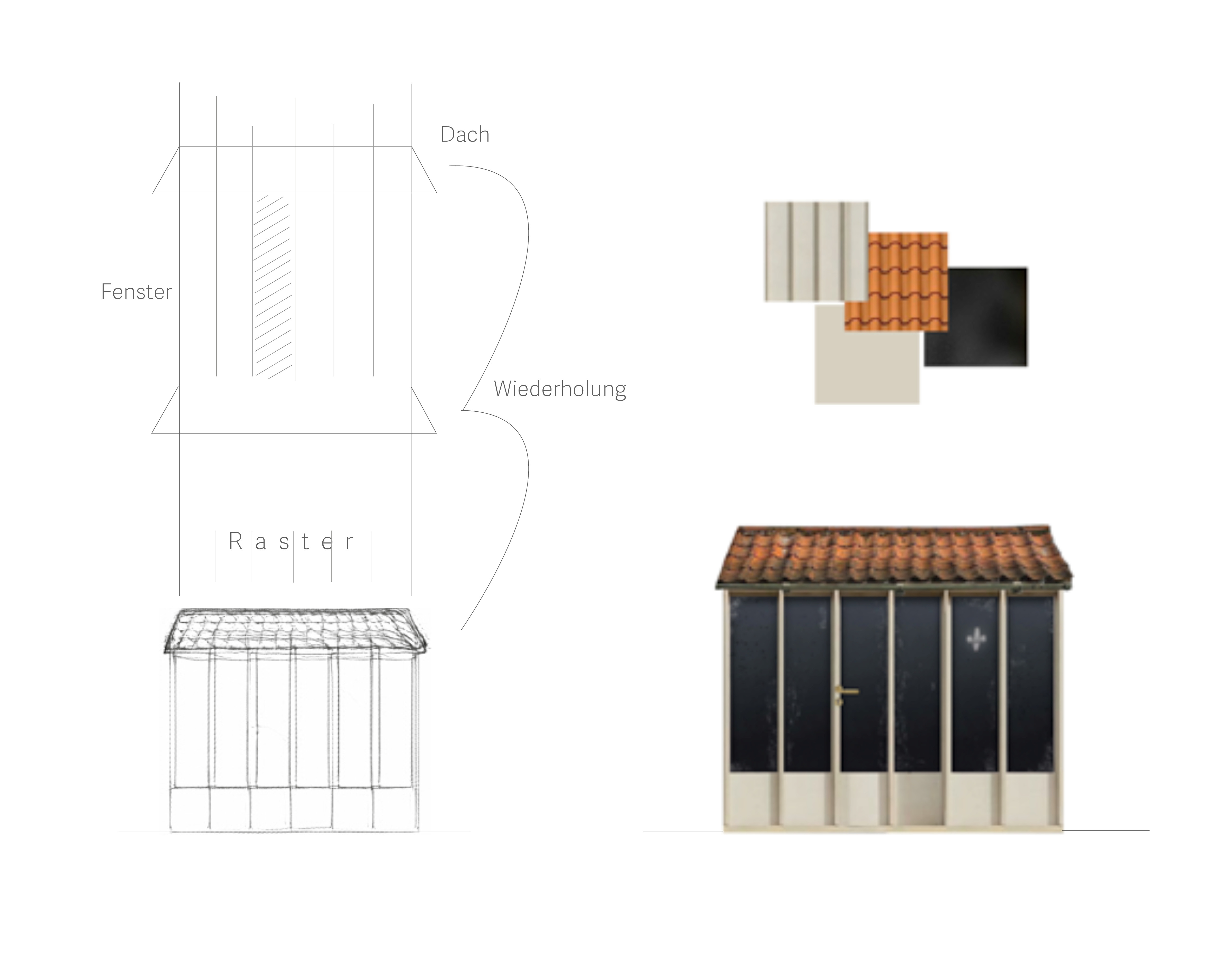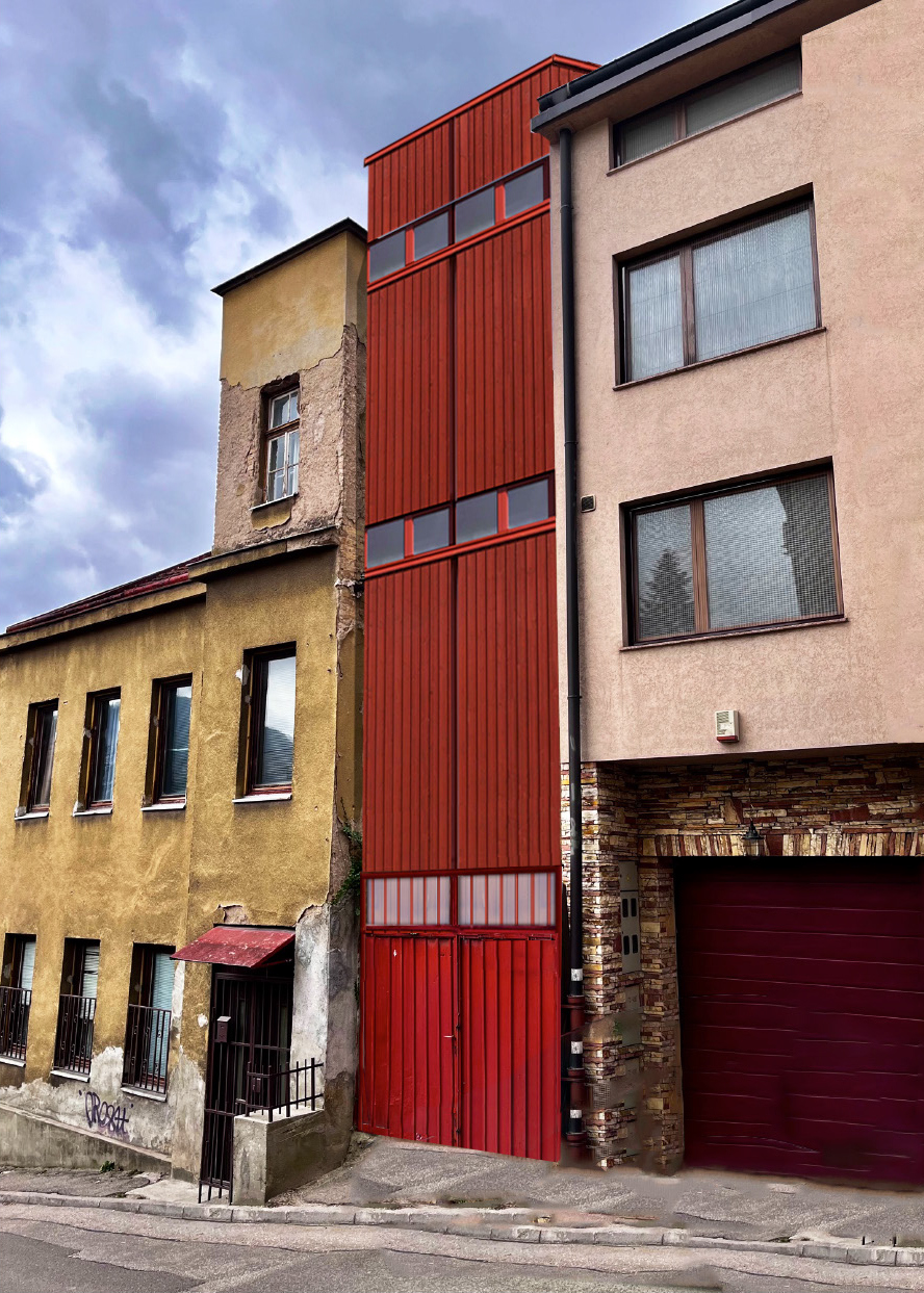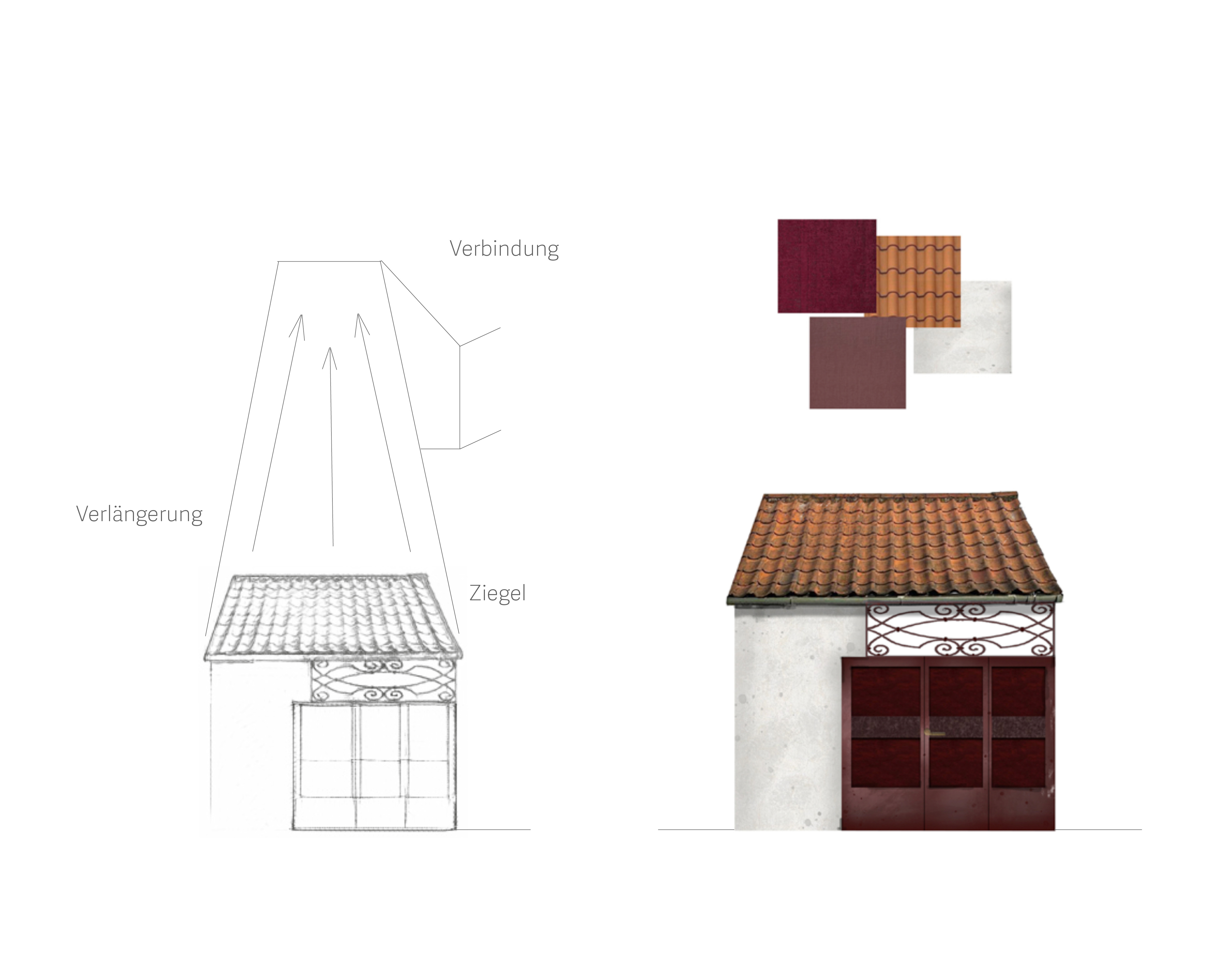 Das erste Tor dient als Ausdruck des entstehenden Gebäudes und bildet zugleich eine eigenständige architektonische Identität, die eine gestalterische Verbindung zwischen Bestand und neuer Struktur schafft. Um eine gestalterische Verbindung zu schaffen, sind die vertikalen Linien des Tores übernommen und weitergeführt, die zwei oberen Öffnungen des Tores in Fenster umgewandelt, sodass sie nicht nur ästhetisch, sondern auch funktional in das Gesamtkonzept integriert werden. Mit dem Ziel, diese Torstruktur nicht nur als Eingangselement zu betrachten, sondern als Ausgangspunkt für die Entwicklung einer neuen Fassade. Dabei wird die Fassade des neuen Gebäudes aus der vorderen Ansicht des Tores heraus entwickelt.