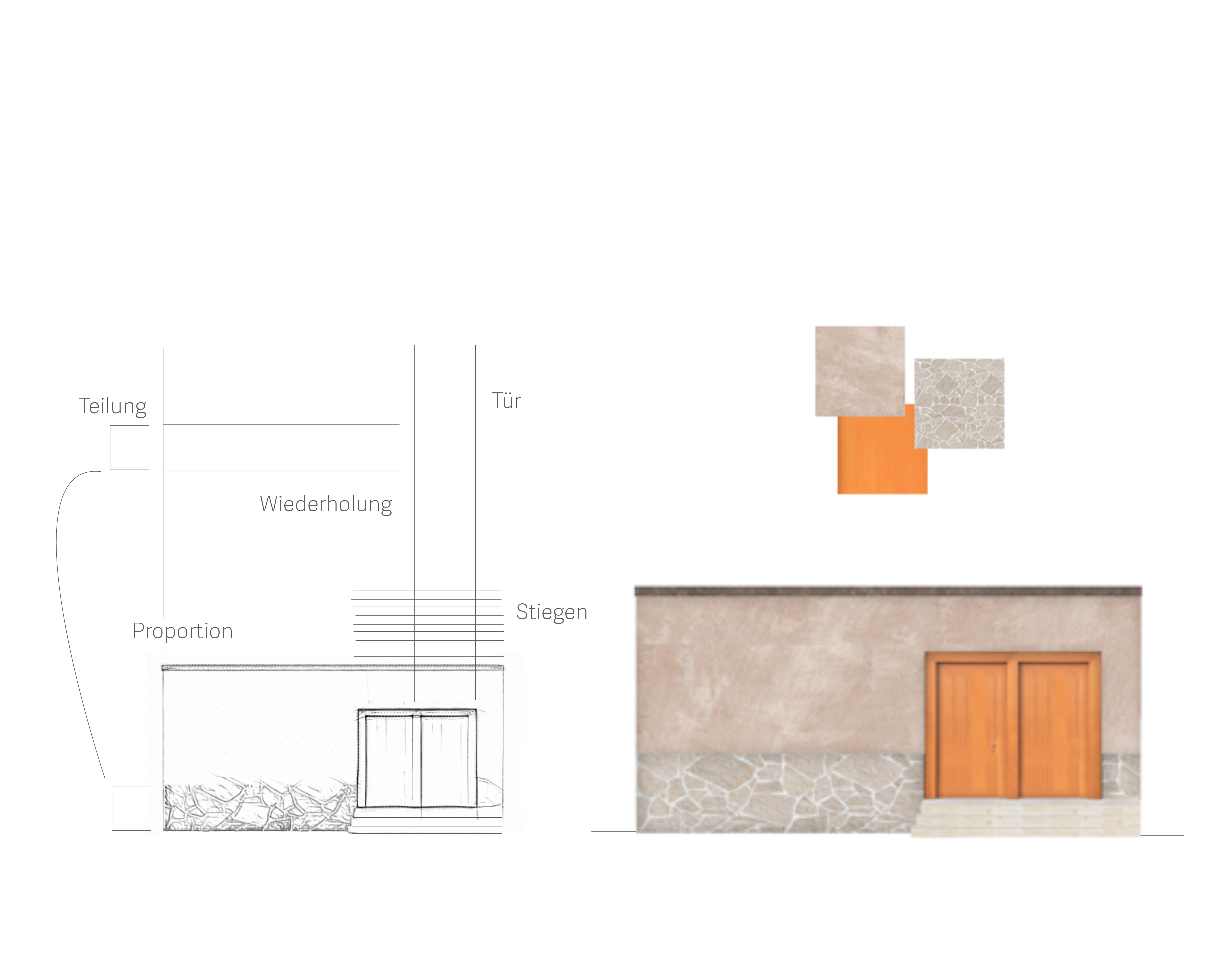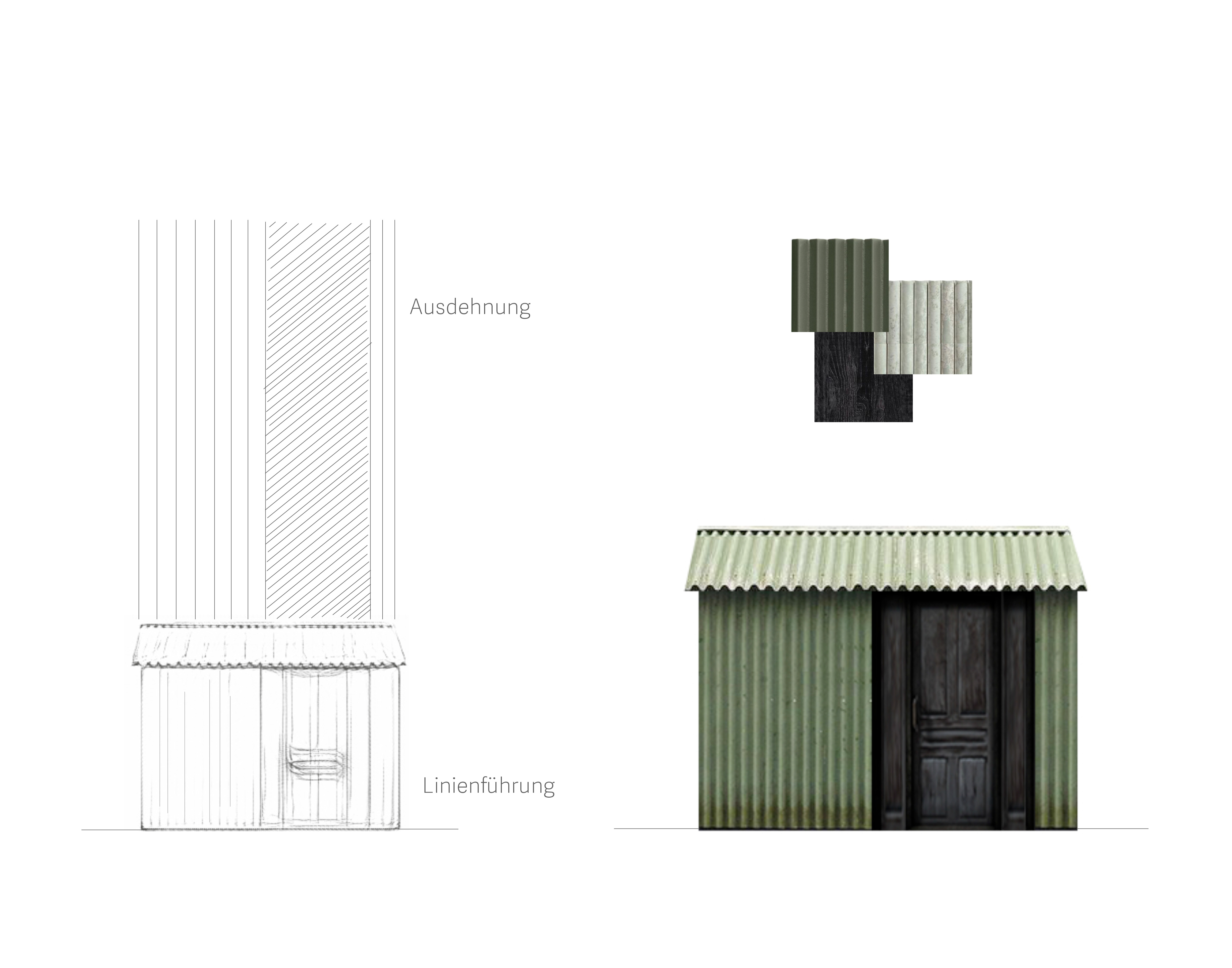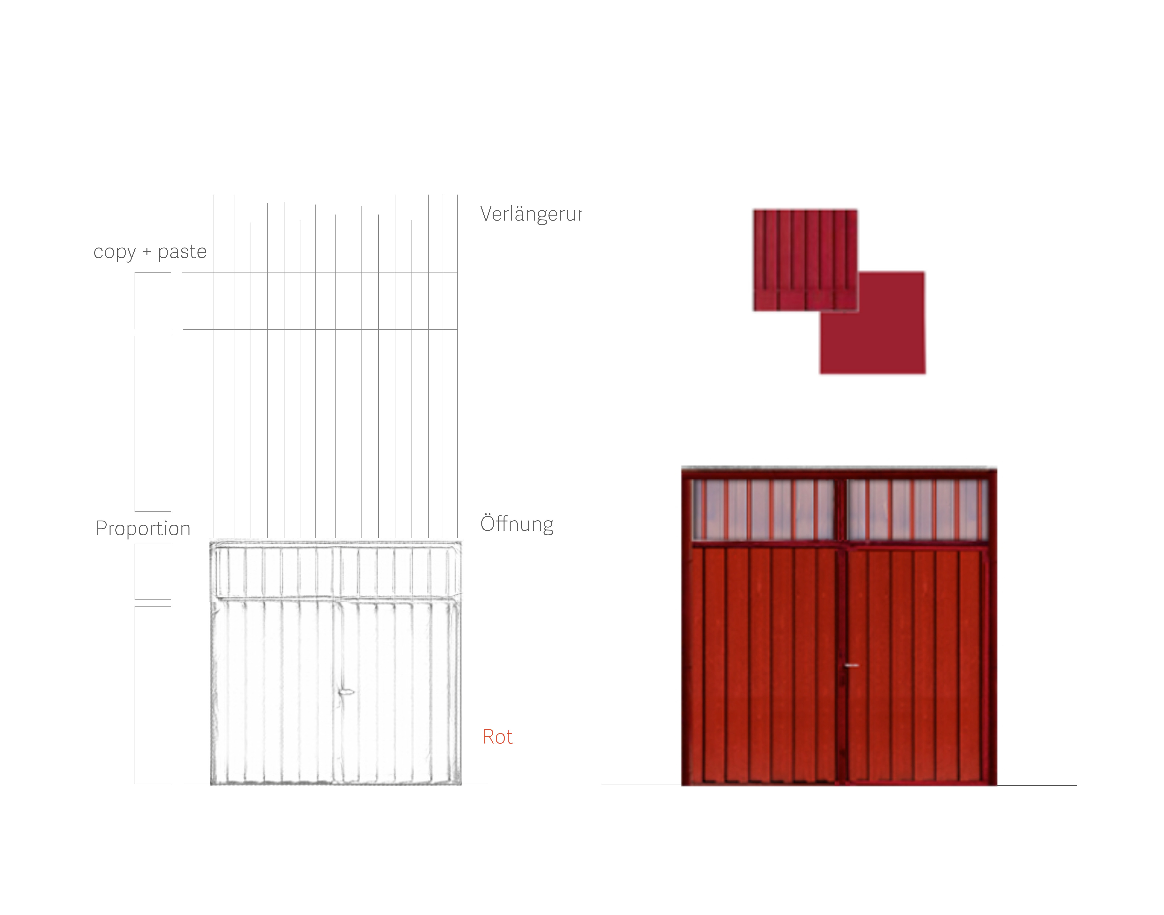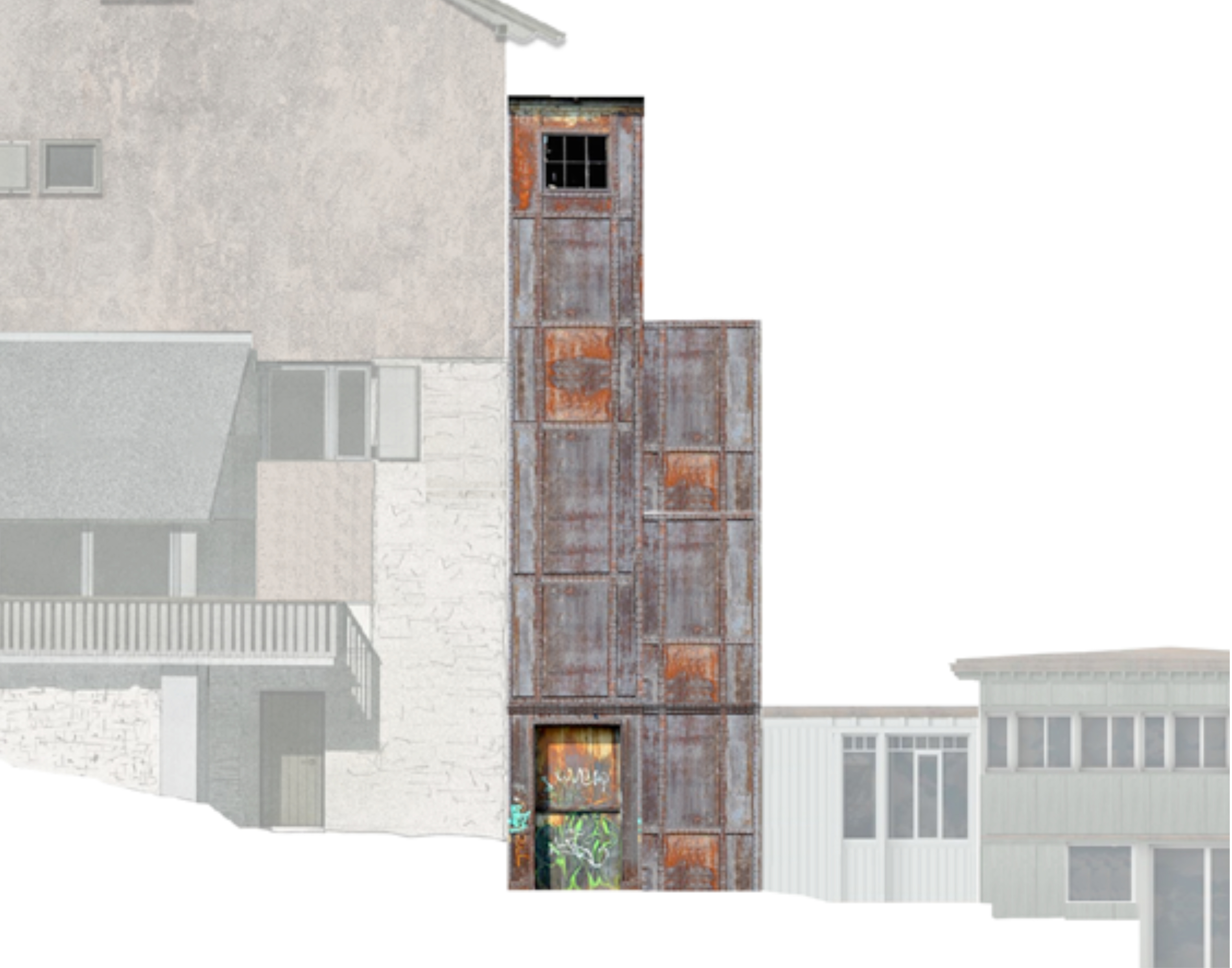 Das erste Tor dient als Ausdruck des entstehenden Gebäudes und bildet zugleich eine eigenständige architektonische Identität, die eine gestalterische Verbindung zwischen Bestand und neuer Struktur schafft. Um eine gestalterische Verbindung zu schaffen, sind die vertikalen Linien des Tores übernommen und weitergeführt, die zwei oberen Öffnungen des Tores in Fenster umgewandelt, sodass sie nicht nur ästhetisch, sondern auch funktional in das Gesamtkonzept integriert werden. Mit dem Ziel, diese Torstruktur nicht nur als Eingangselement zu betrachten, sondern als Ausgangspunkt für die Entwicklung einer neuen Fassade. Dabei wird die Fassade des neuen Gebäudes aus der vorderen Ansicht des Tores heraus entwickelt.