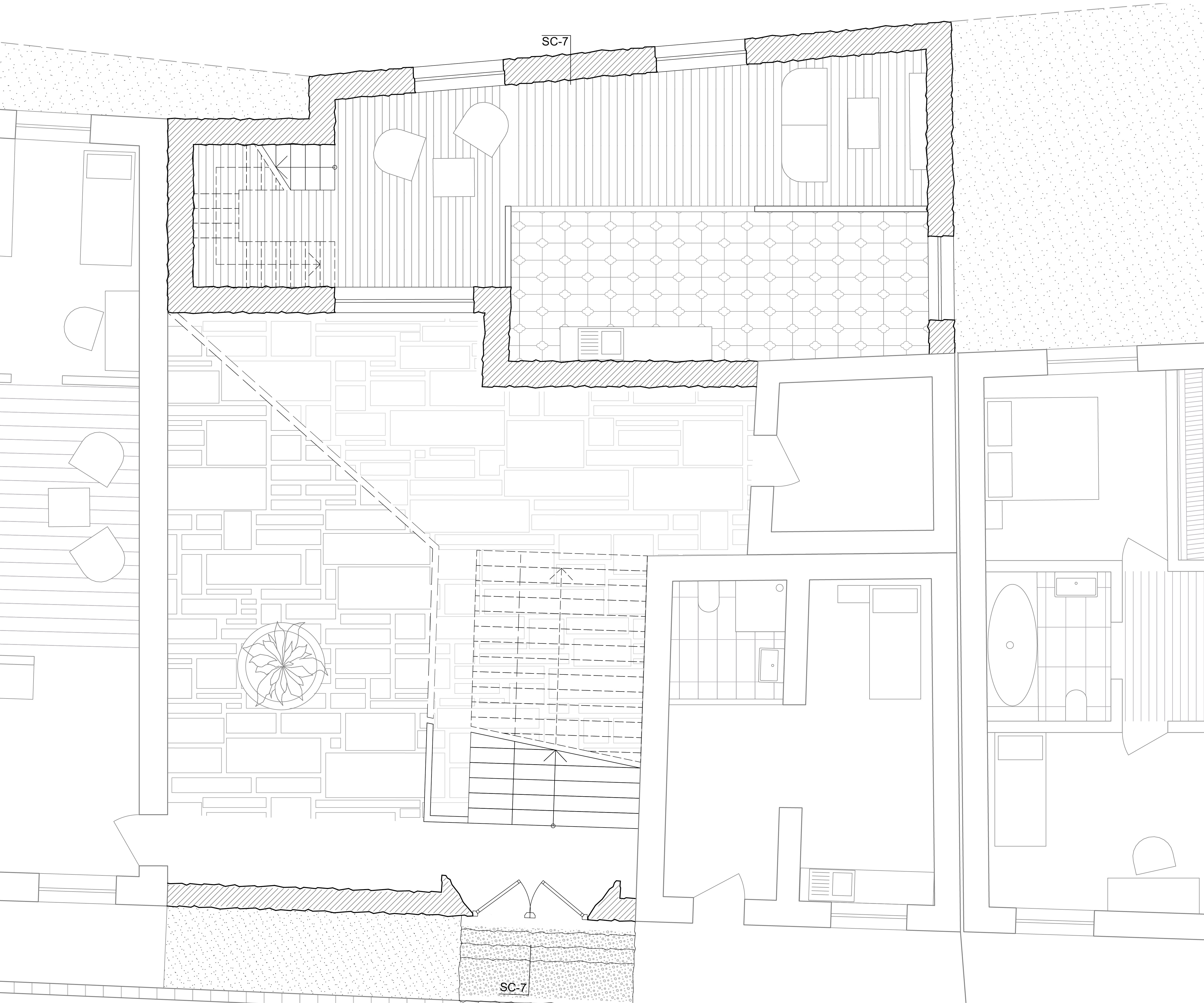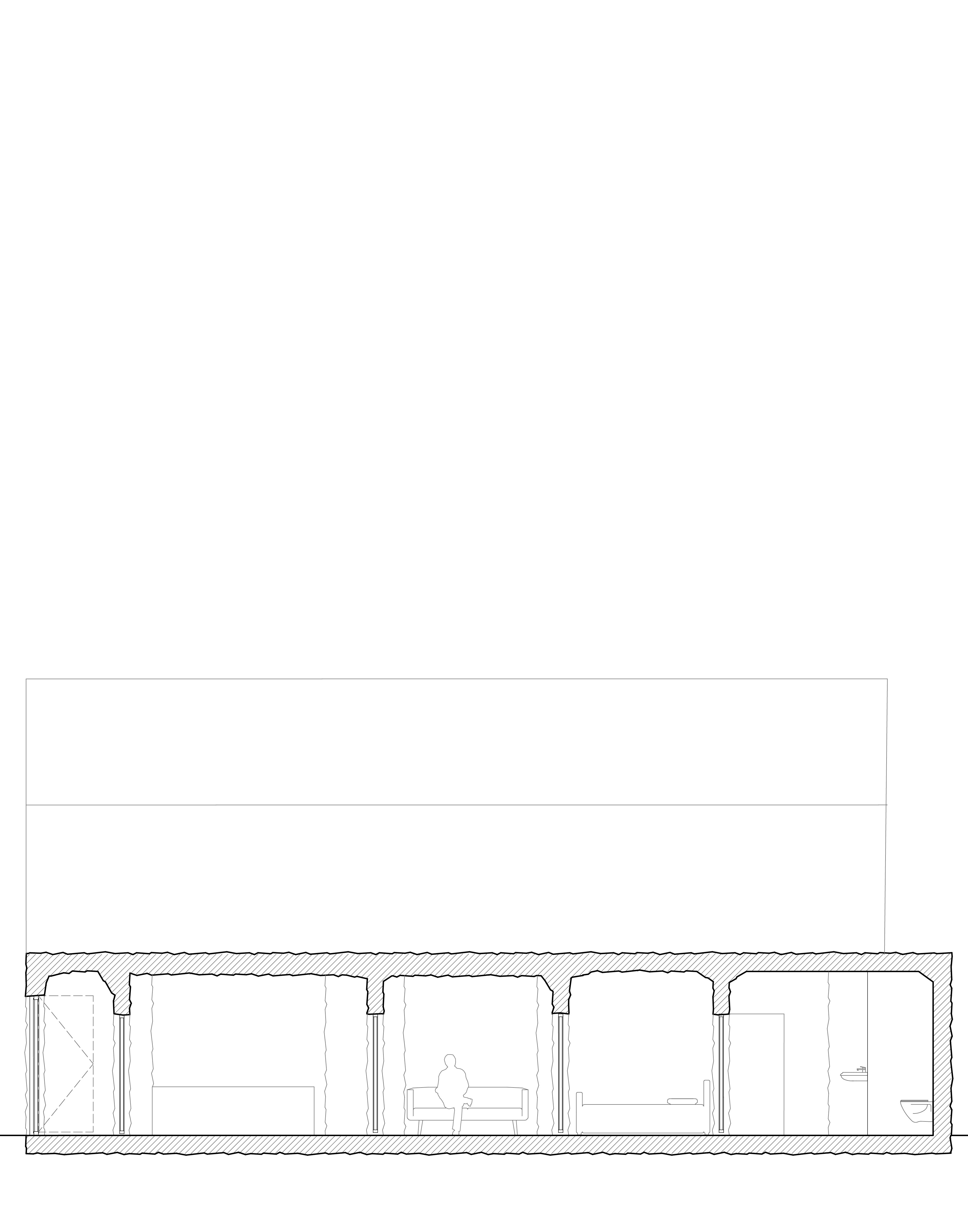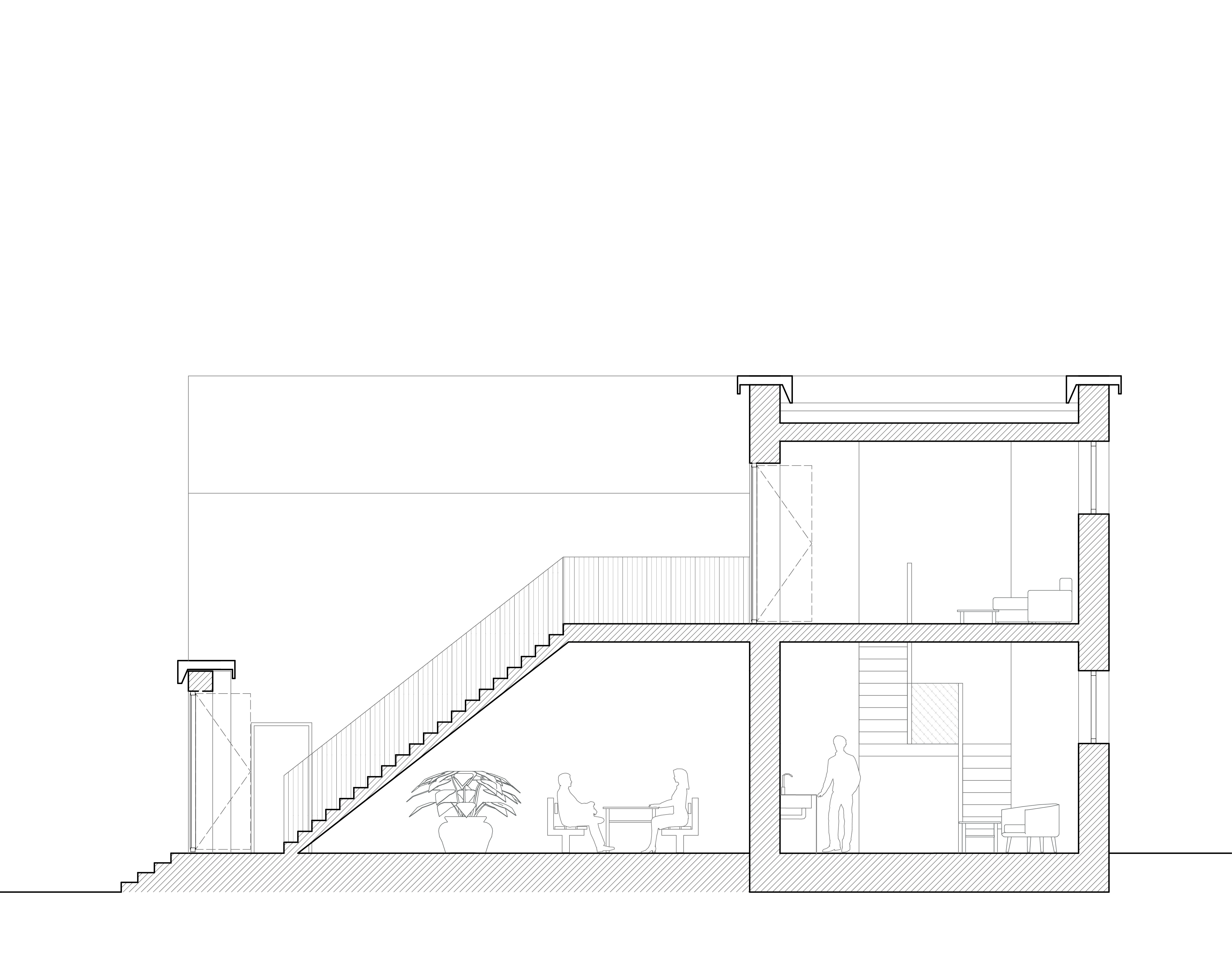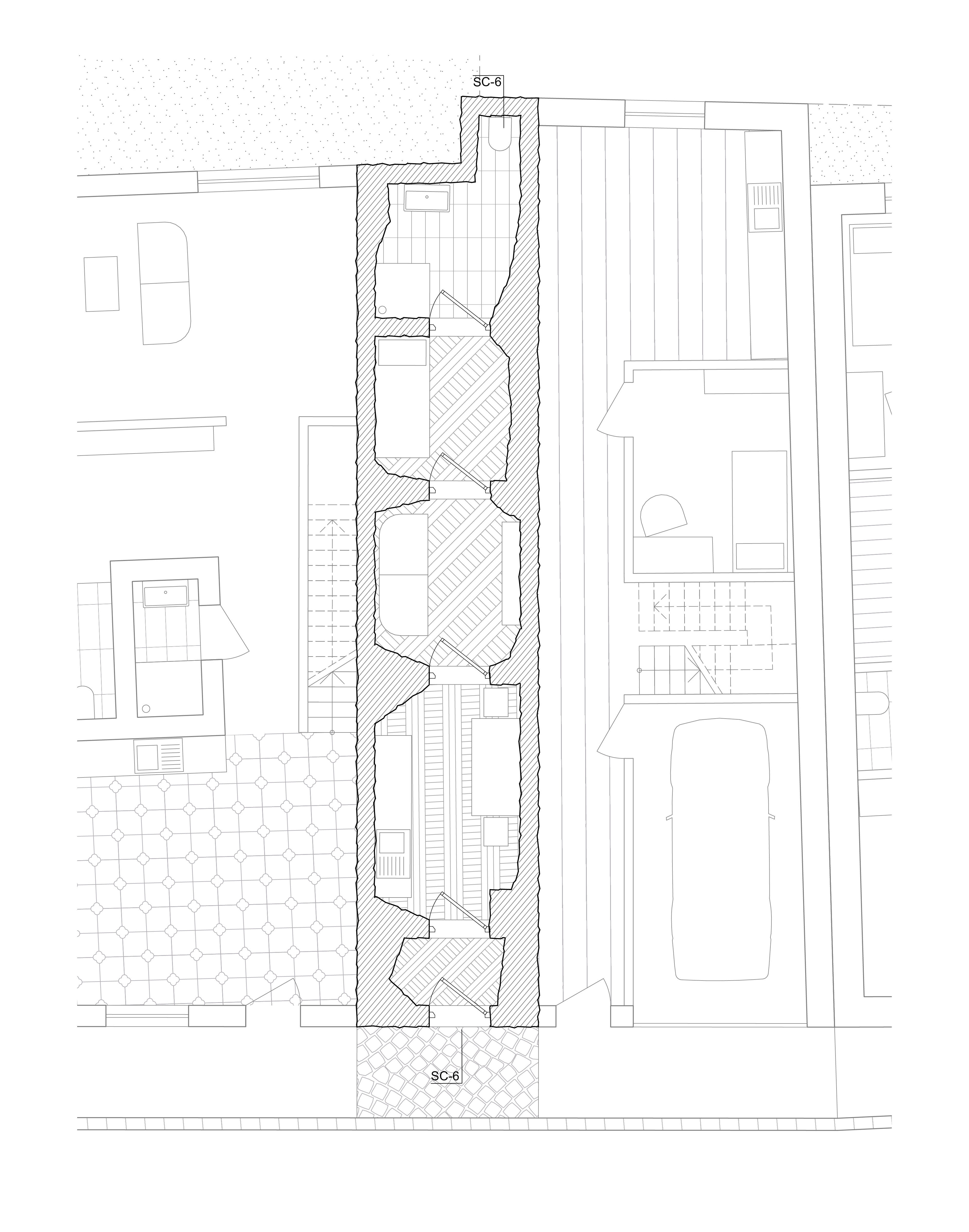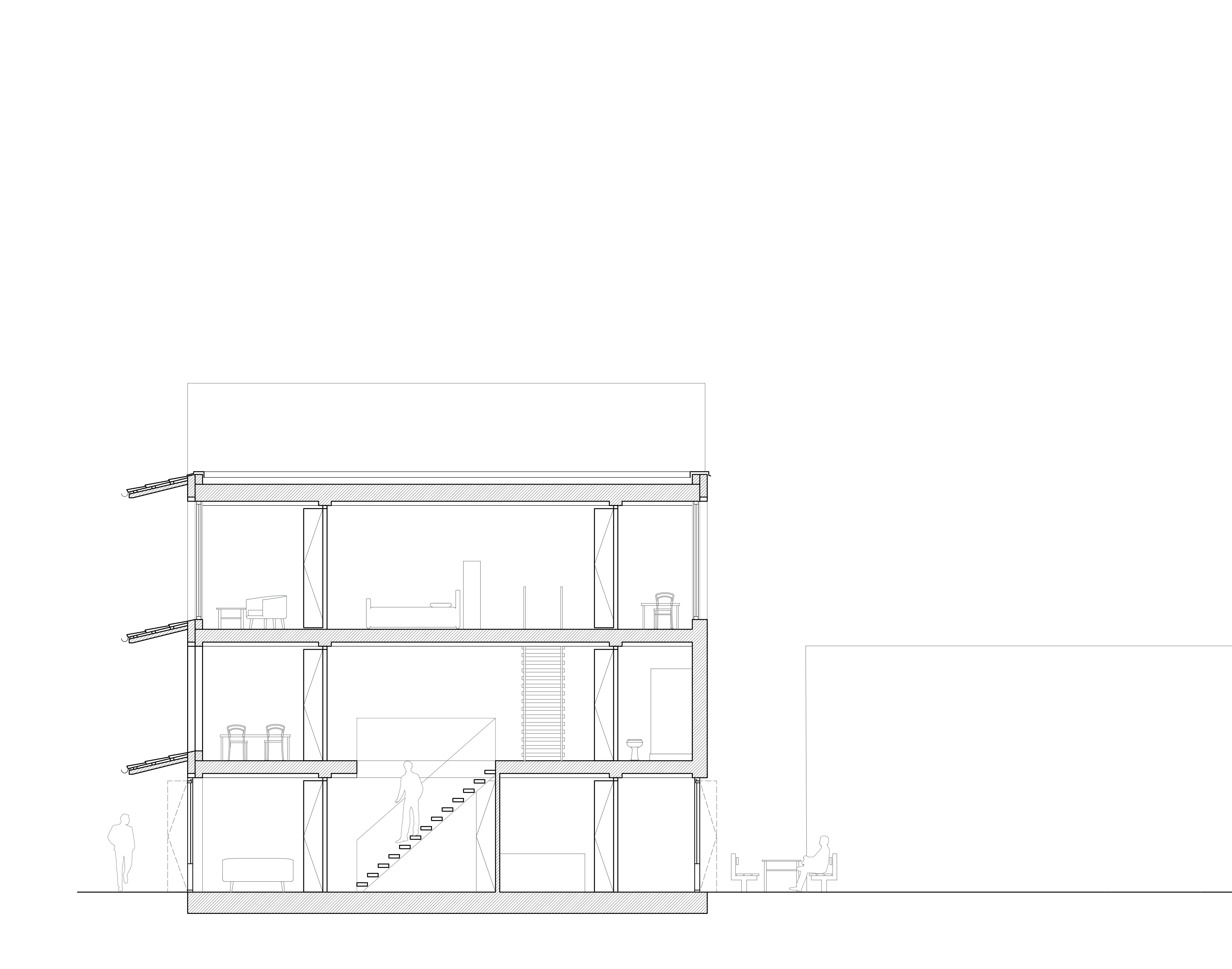 Das sechste Tor, im Gegensatz zu den anderen Toren, die durch ihre vertikale Ausdehnung auffallen, bleibt dieses Tor eingeschossig und folgt einer klar horizontalen Linie. Es ist ein schlichtes Element, das wie ein Rahmen wirkt. Dieser Rahmen zieht sich nur im Grundriss weiter und definiert so den Raum. Das Tor ist so entstanden, das es in Ansicht, zwei benachbarten Häuser verbindet. Beide Gebäude „spüren“ das Tor, es zieht sich durch beide Häuser hindurch. In seiner Gestaltung ist das sechste Tor also ein Statement der Einfachheit und Kontinuität, das den Fokus auf den horizontalen Zusammenhang legt und die beiden Gebäude in ihrer Gesamtheit verbindet.