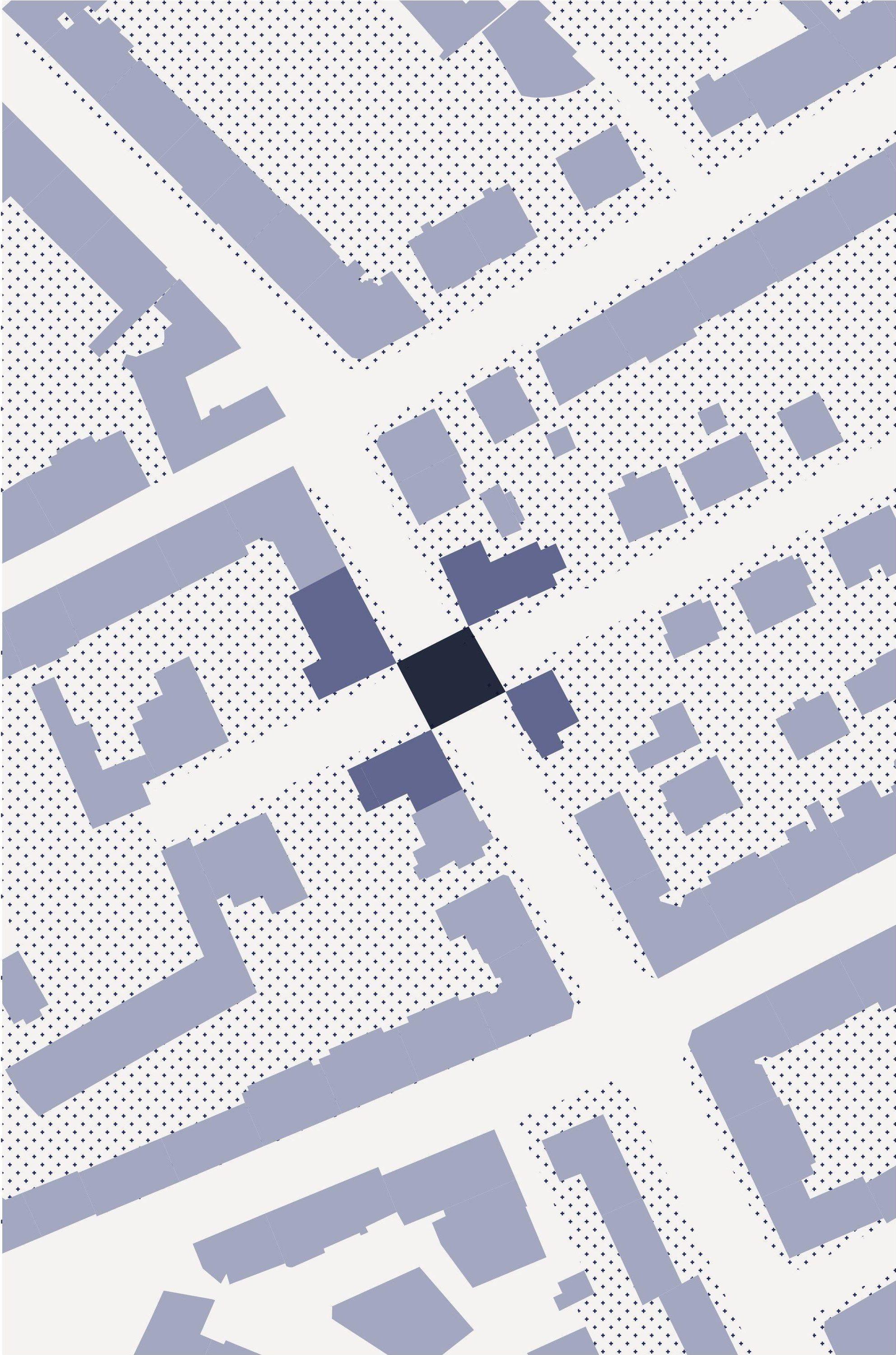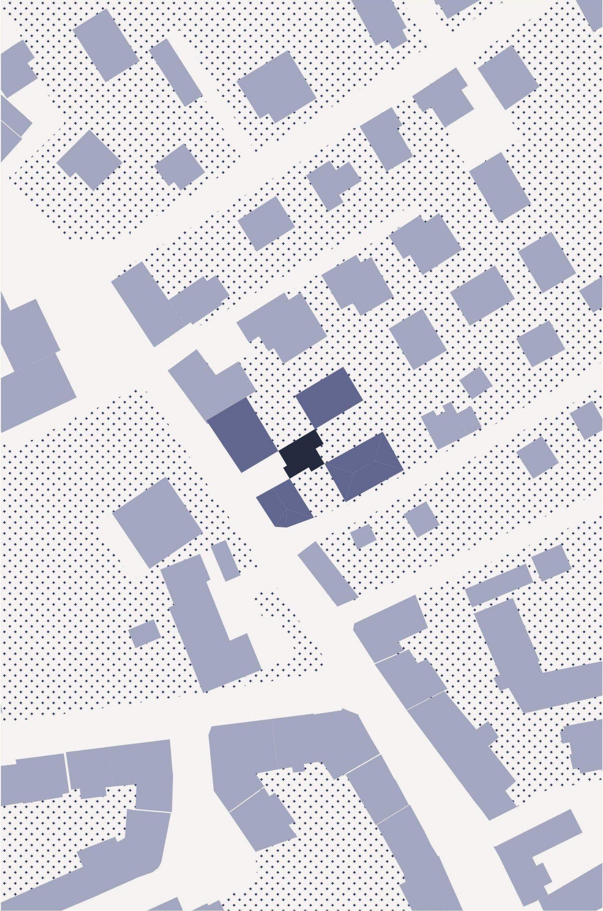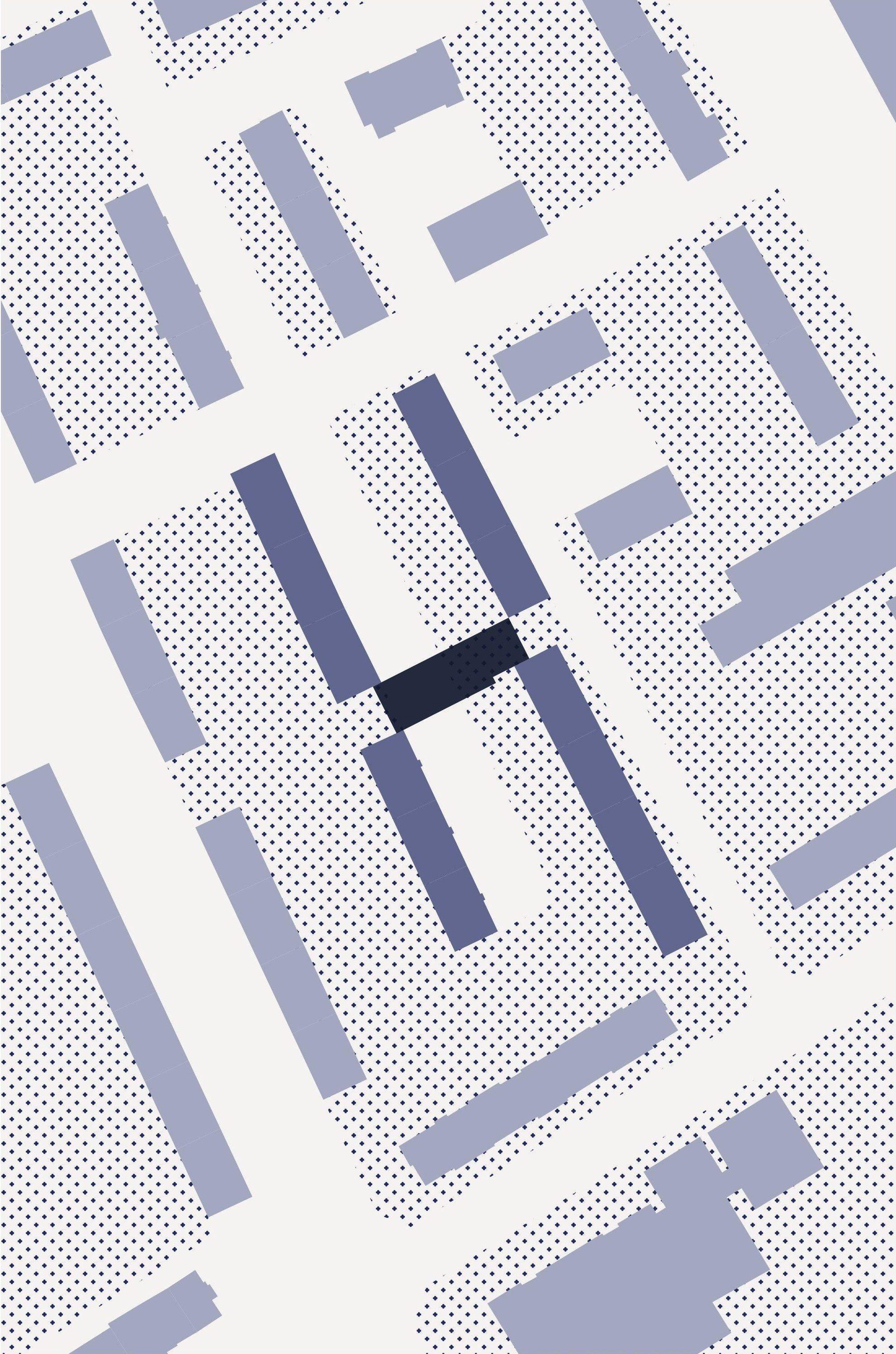 Diese Arbeit nimmt sich dem Teppich aus Solitären und den dadurch entstehenden Zwischenräumen an und sieht sie als Ausgangspunkt architektonischer Intervention. Dort, wo der städtebauliche Zusammenhang fehlt, wird der Zwischenraum neu interpretiert. Es werden Häuser gesetzt, die immer an vier Ecken an Bestandshäuser anschließen und so den Raum neu fassen und erfassbar machen. Sie schaffen Raum, anstatt ihn zu verdrängen.