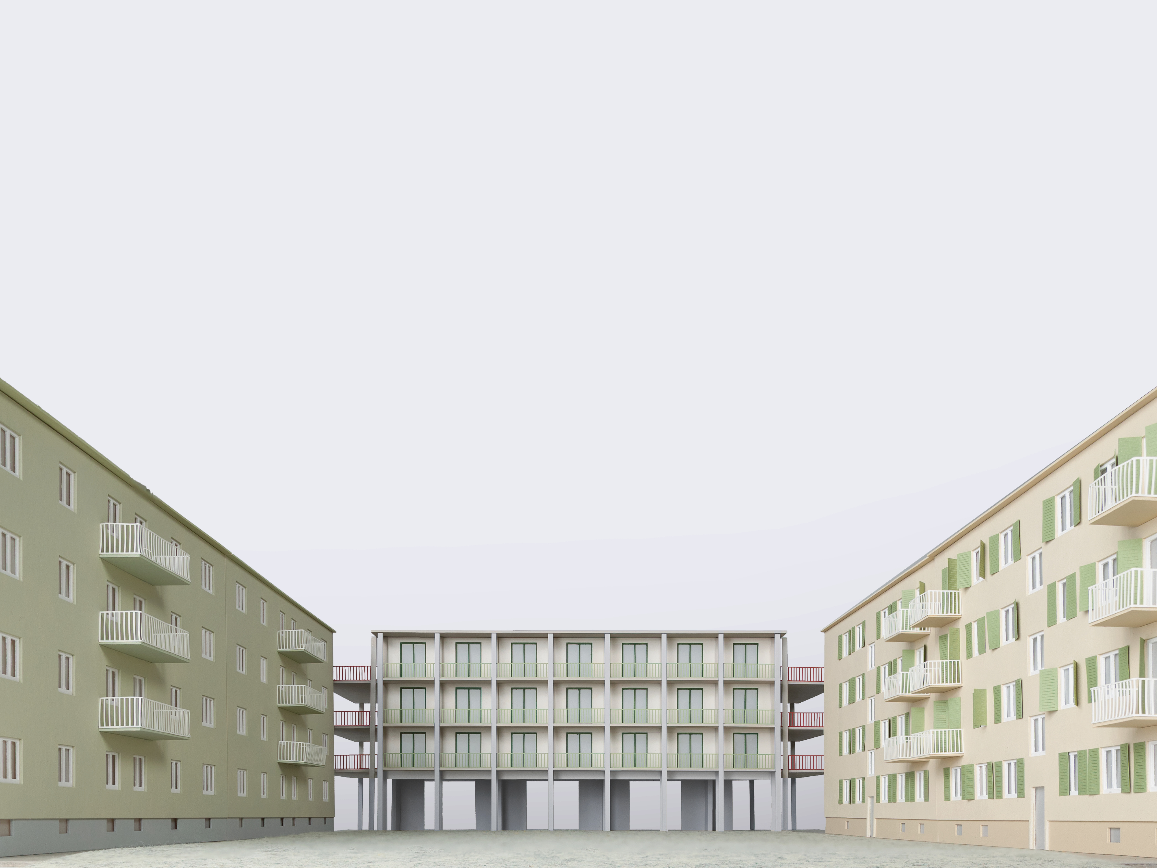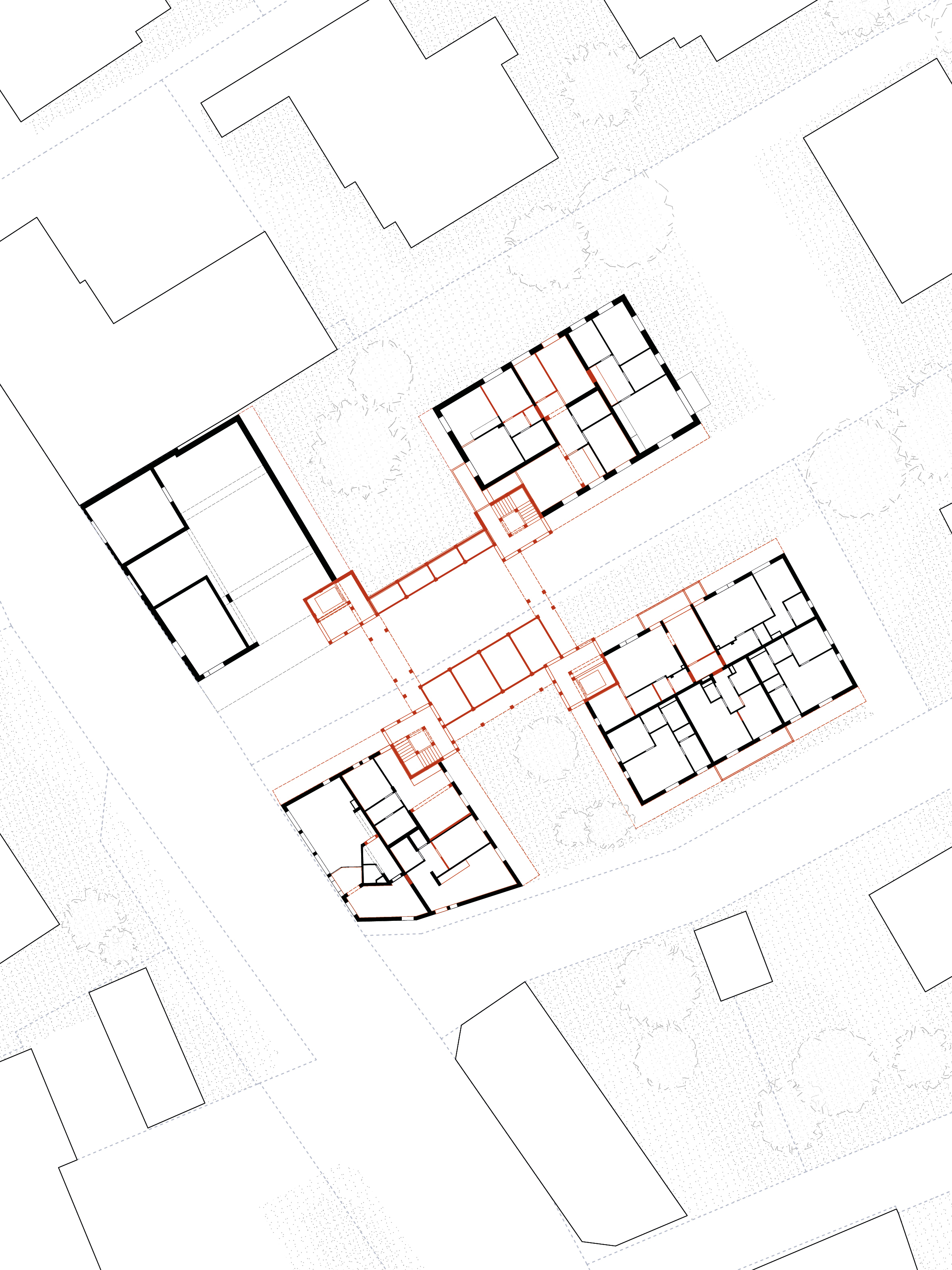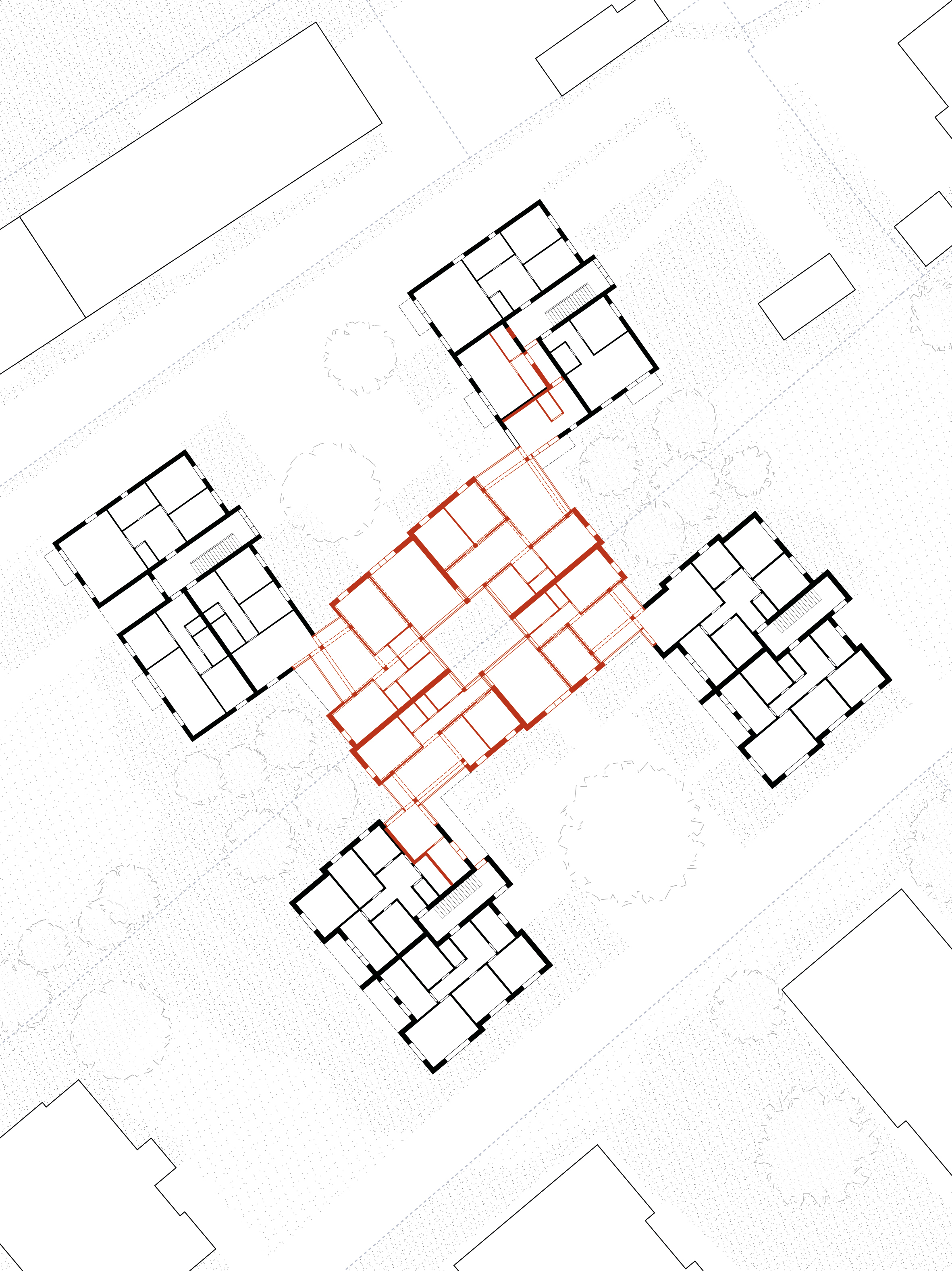 Diese Arbeit nimmt sich dem Teppich aus Solitären und den dadurch entstehenden Zwischenräumen an und sieht sie als Ausgangspunkt architektonischer Intervention. Dort, wo der städtebauliche Zusammenhang fehlt, wird der Zwischenraum neu interpretiert. Es werden Häuser gesetzt, die immer an vier Ecken an Bestandshäuser anschließen und so den Raum neu fassen und erfassbar machen. Sie schaffen Raum, anstatt ihn zu verdrängen.