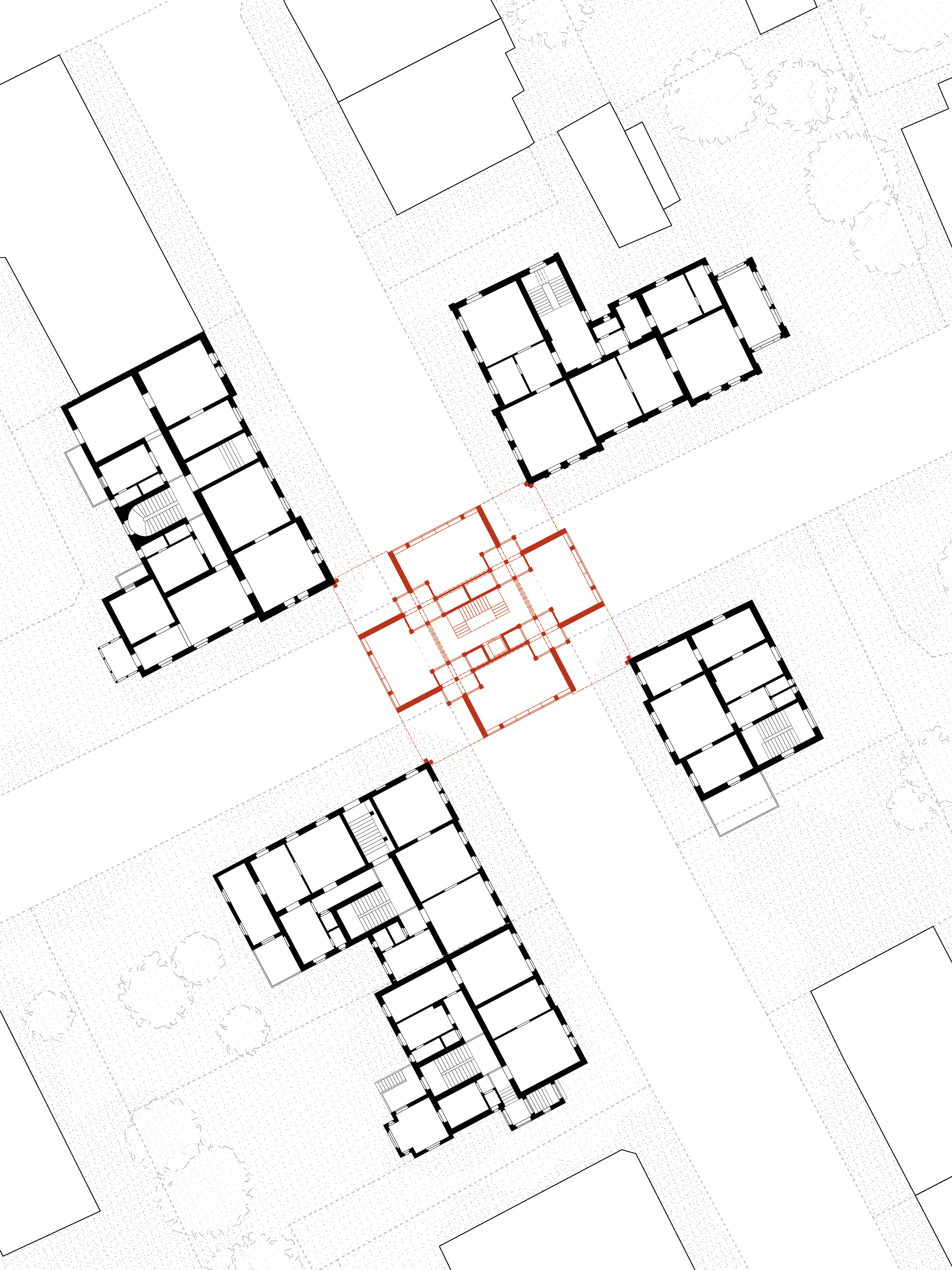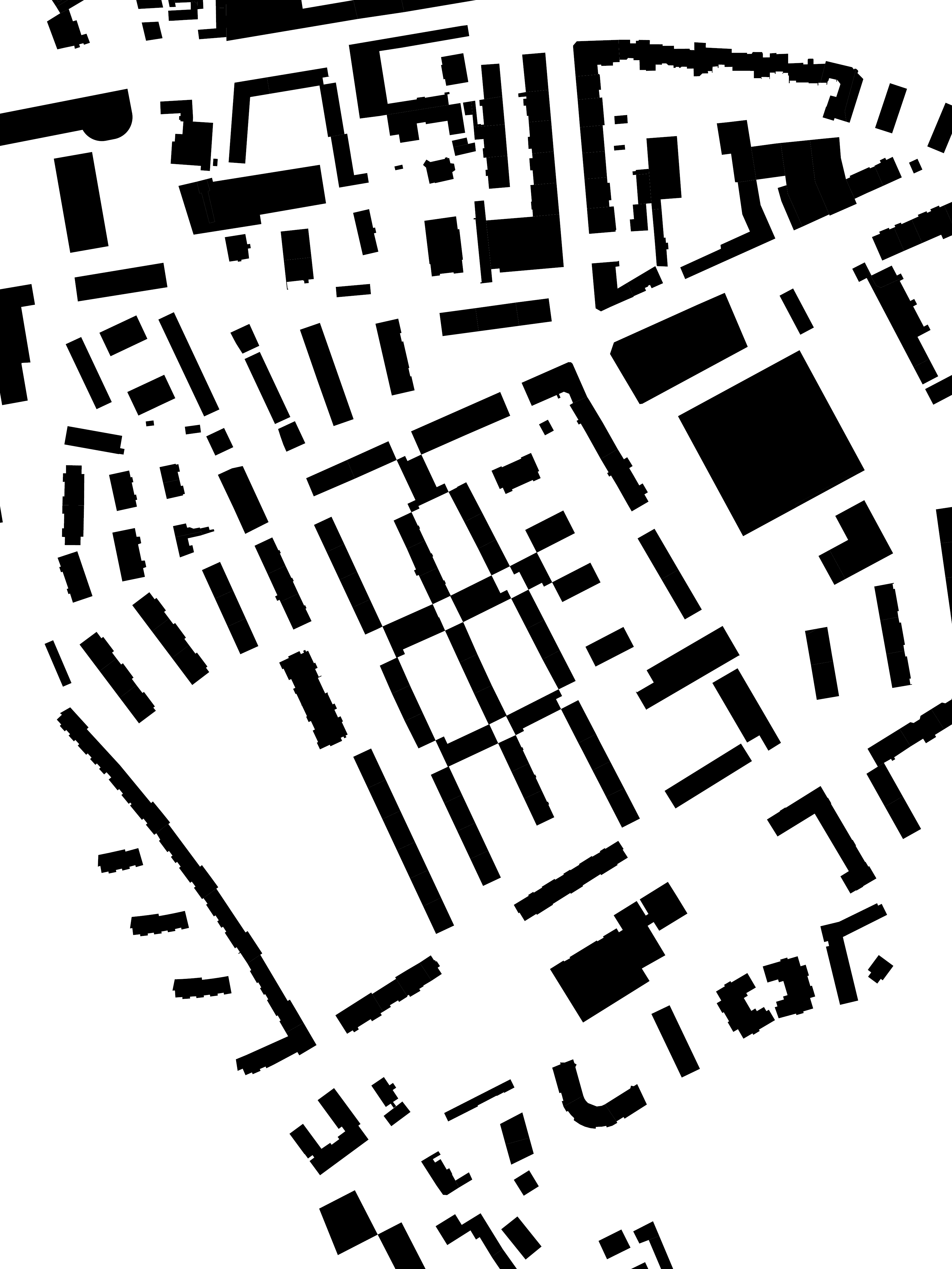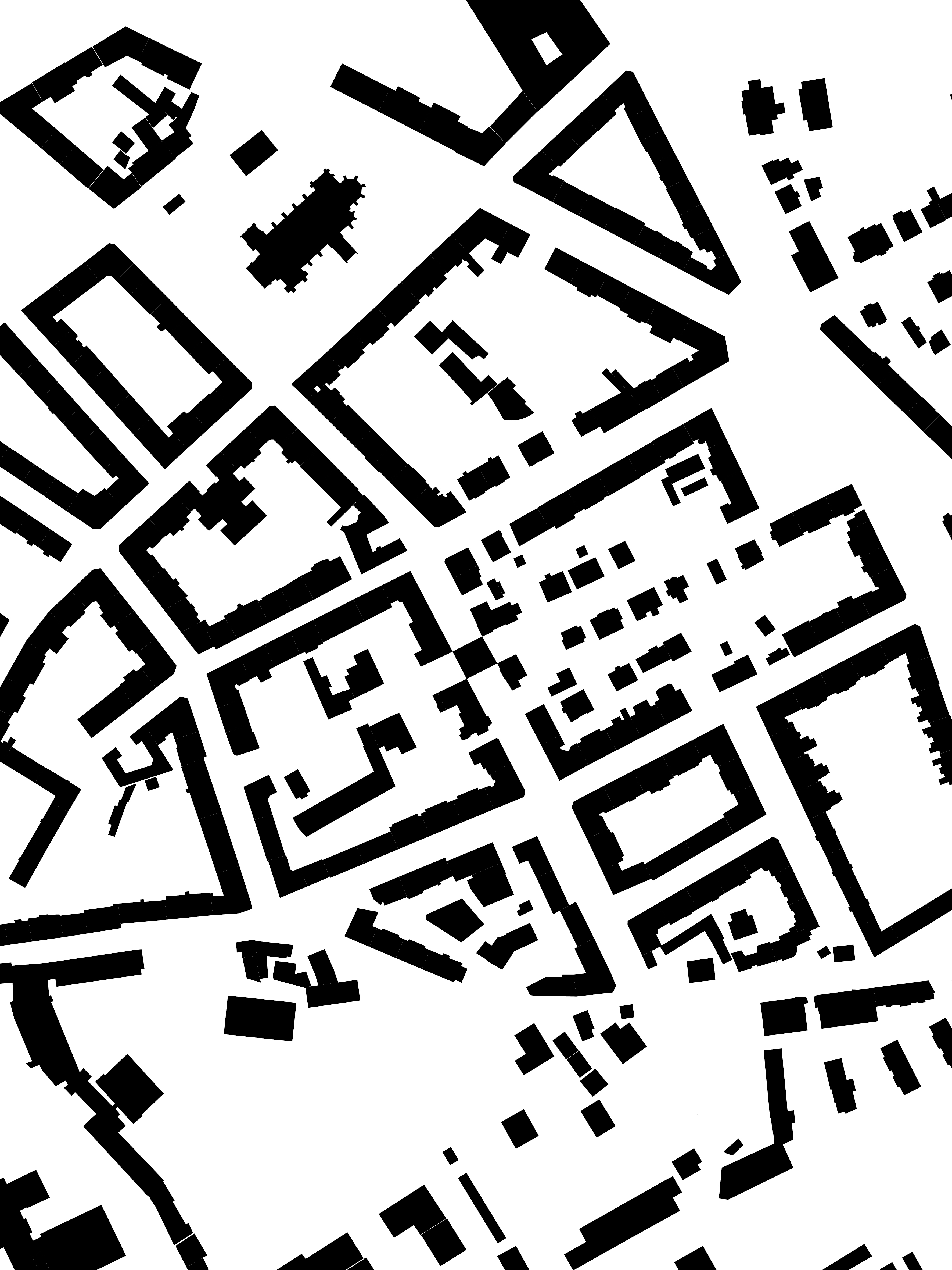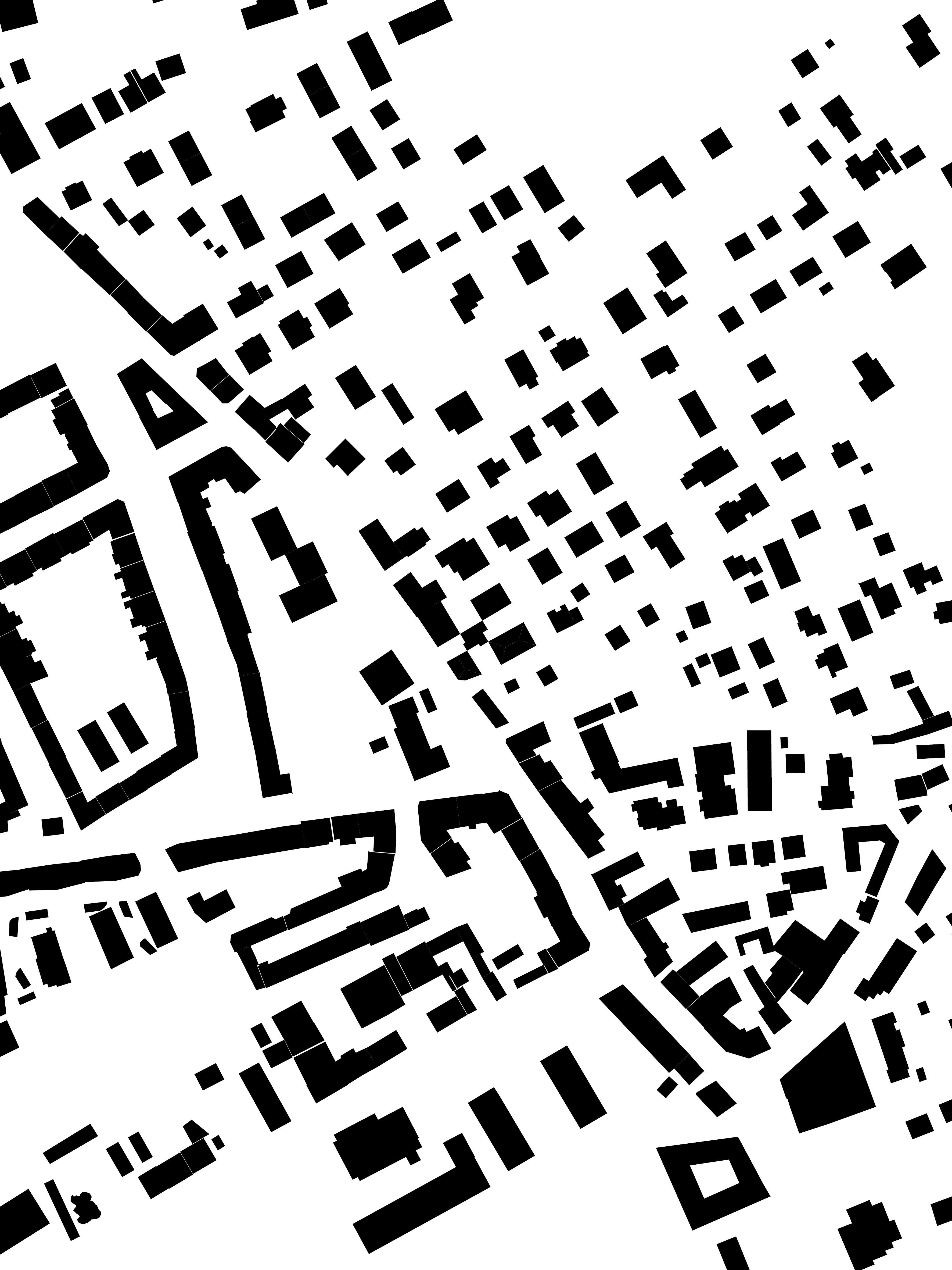 Betrachtet man die Zwischenhäuser im Schwarzplan, verändert sich das Erscheinungsbild der vormals solitären Bauten. Aus losen Objekten im Feld wird ein durchgehendes Gefüge.