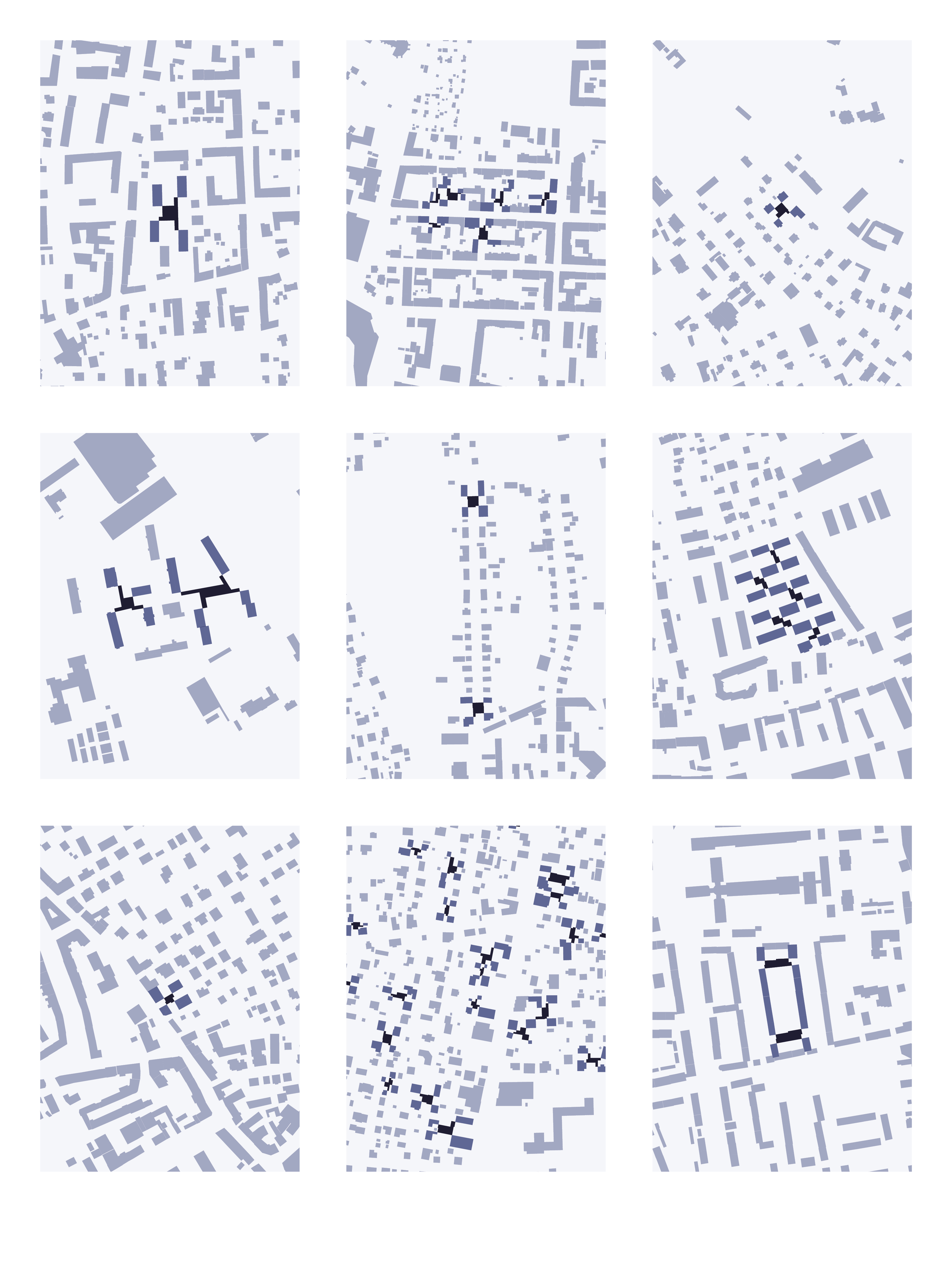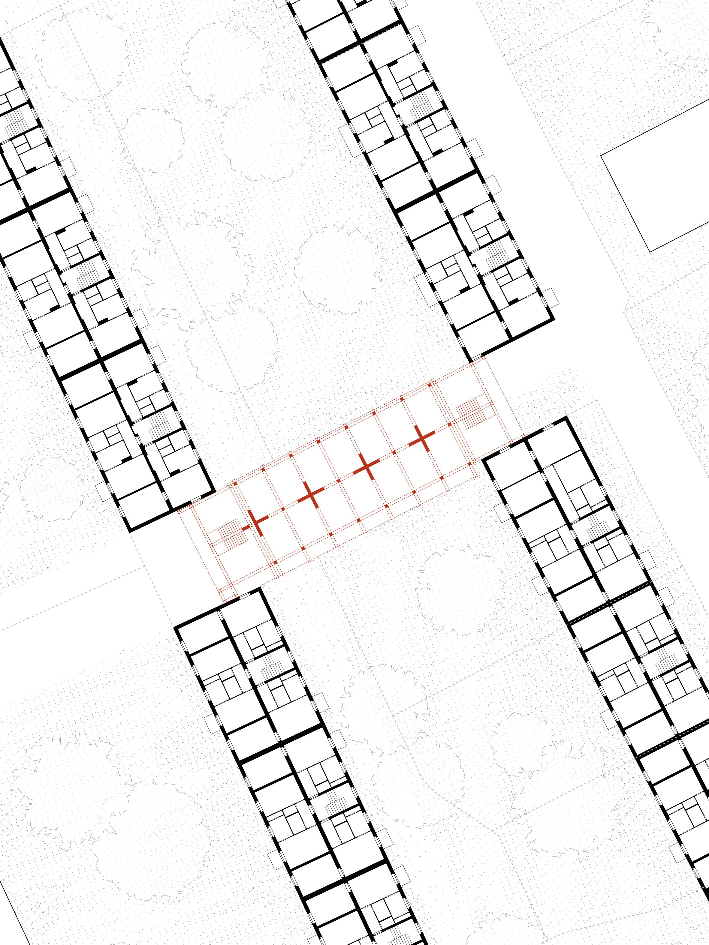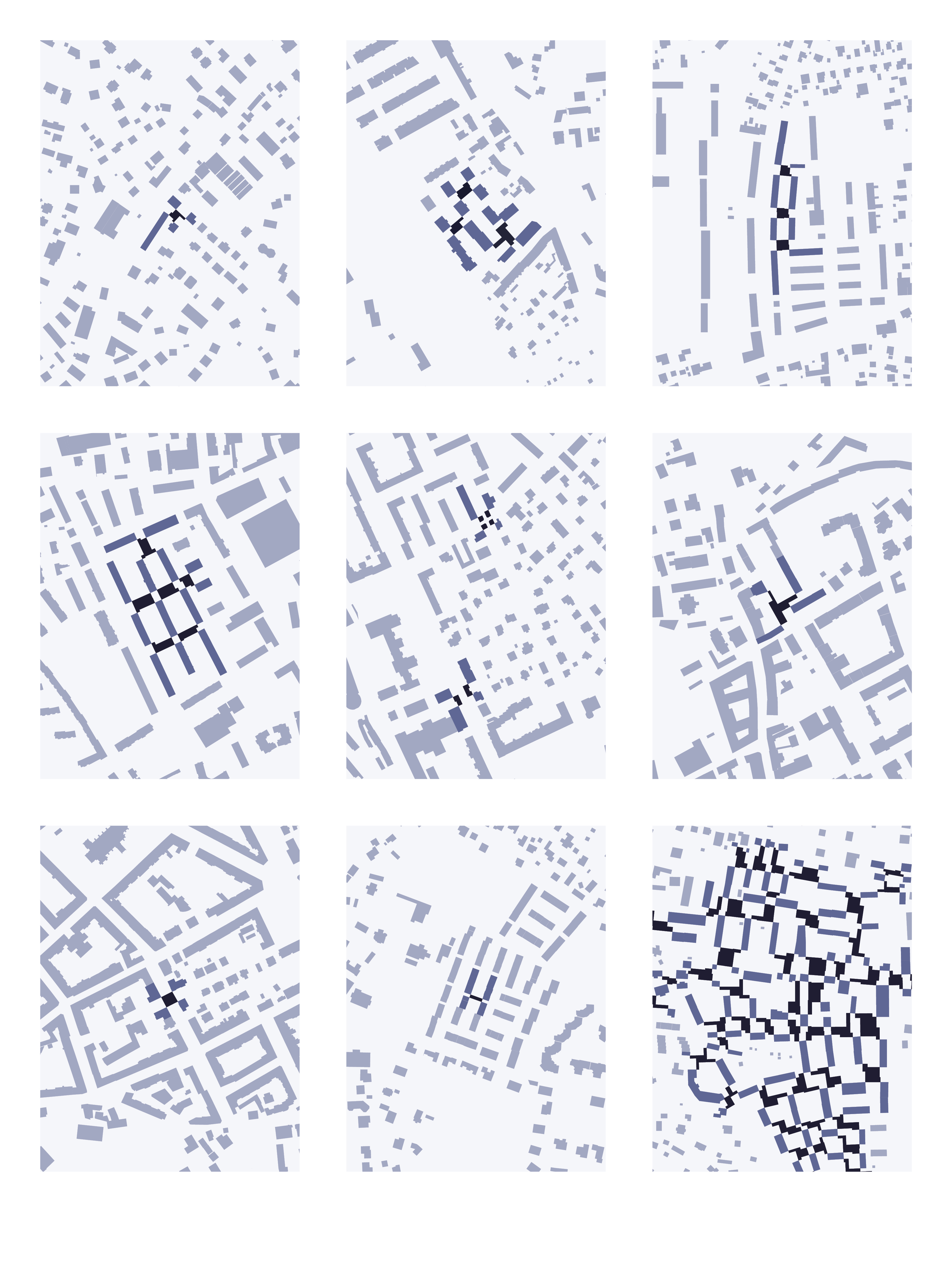 Betrachtet man die Zwischenhäuser im Schwarzplan, verändert sich das Erscheinungsbild der vormals solitären Bauten. Aus losen Objekten im Feld wird ein durchgehendes Gefüge.