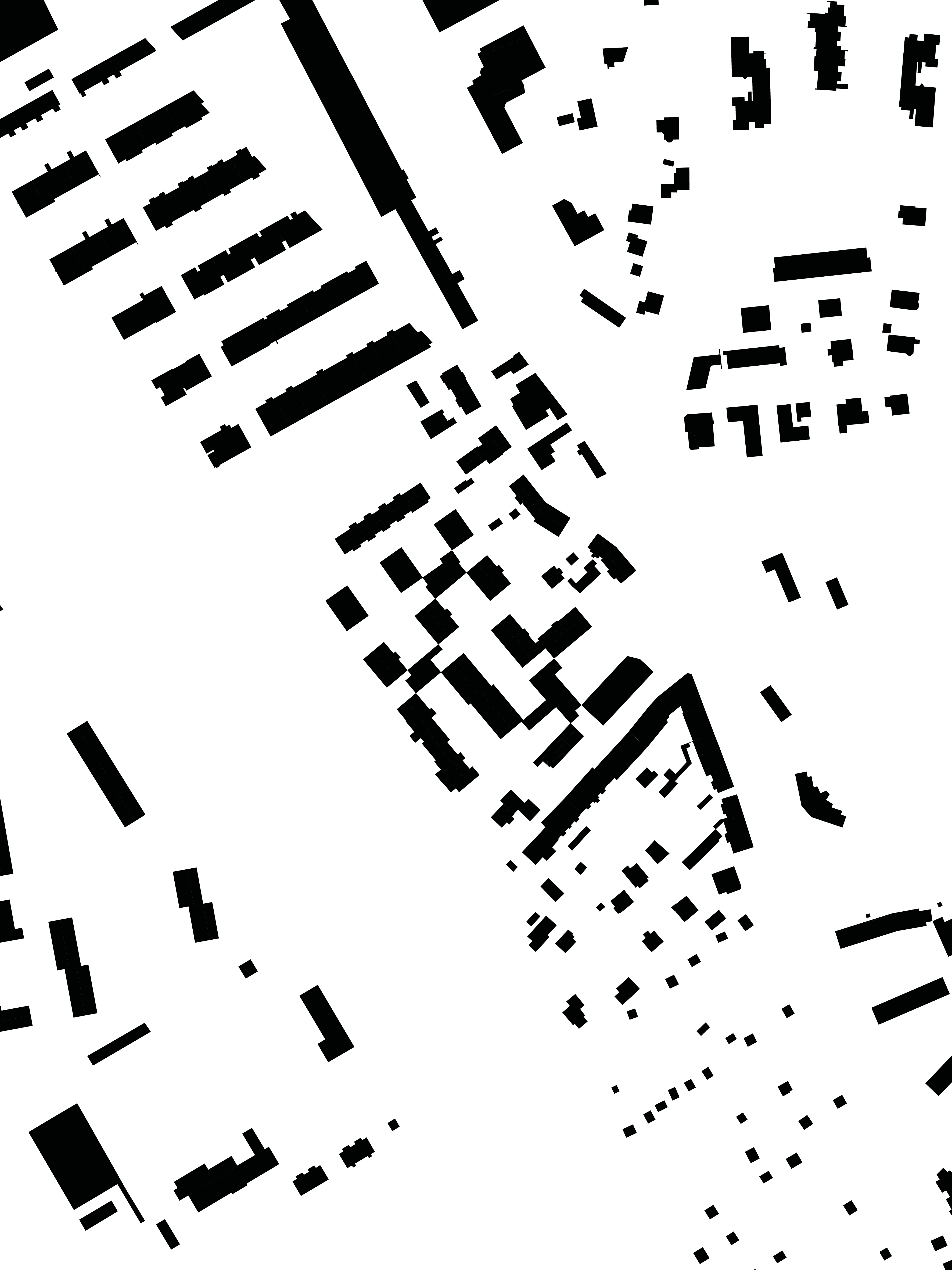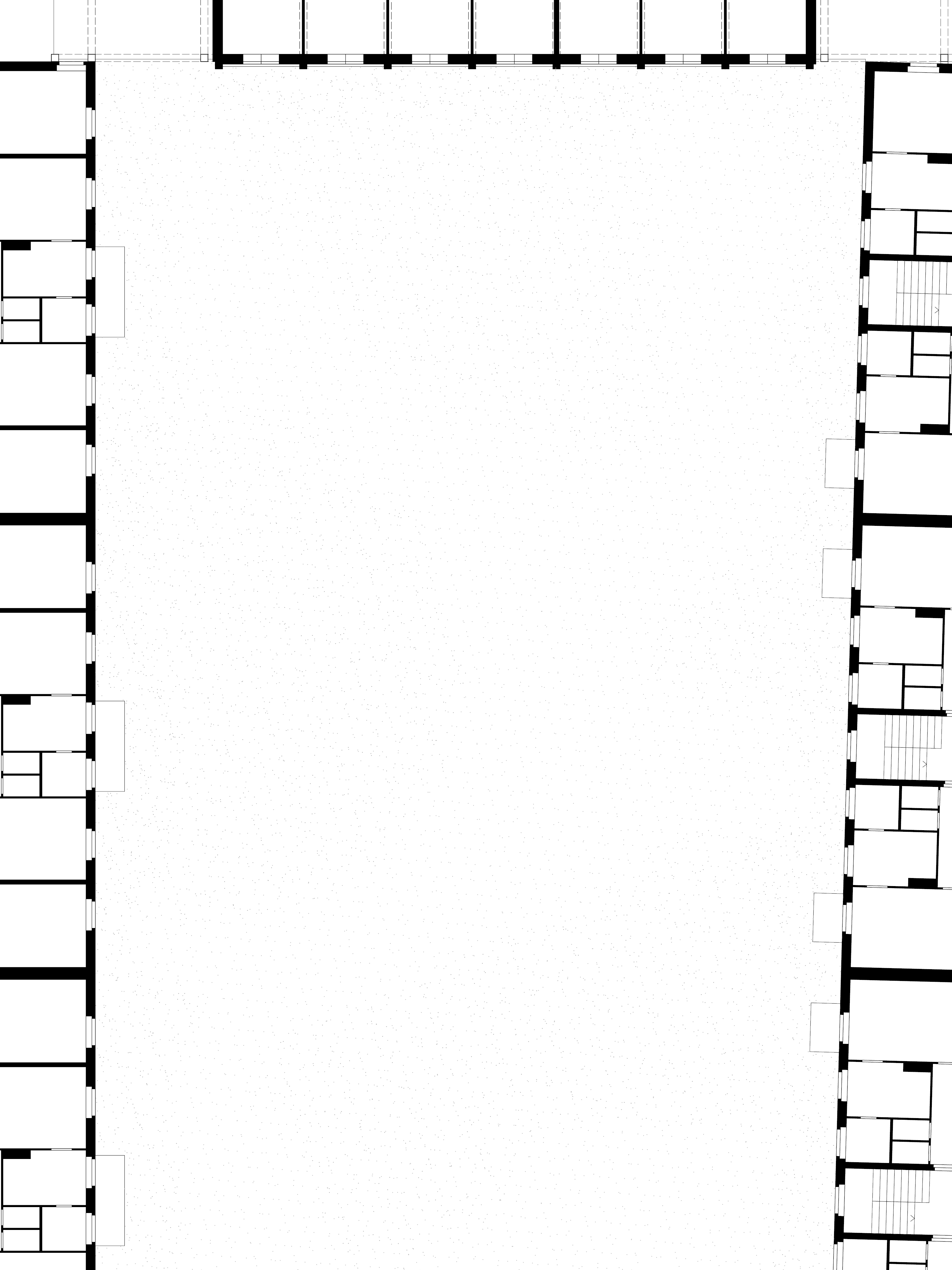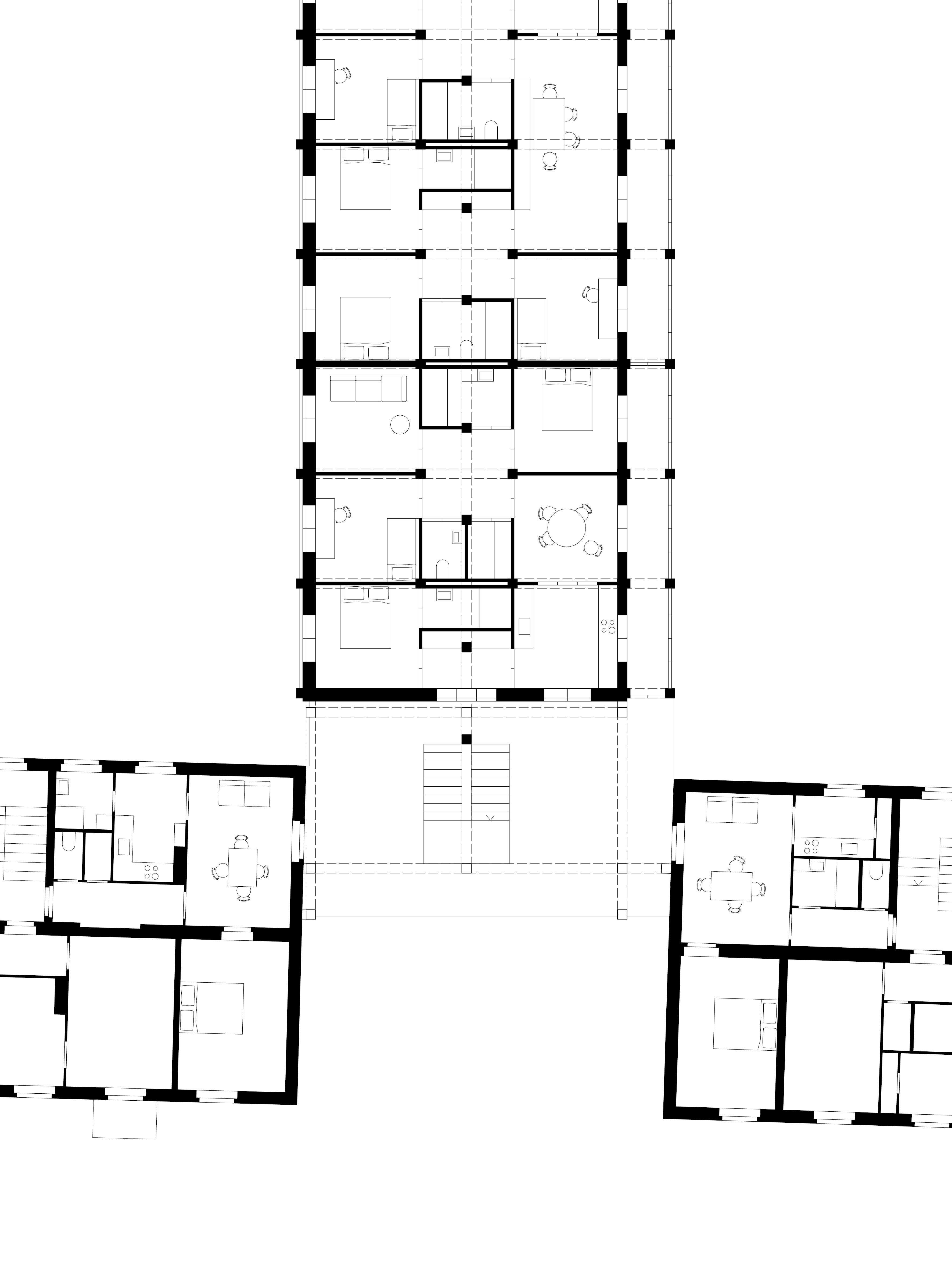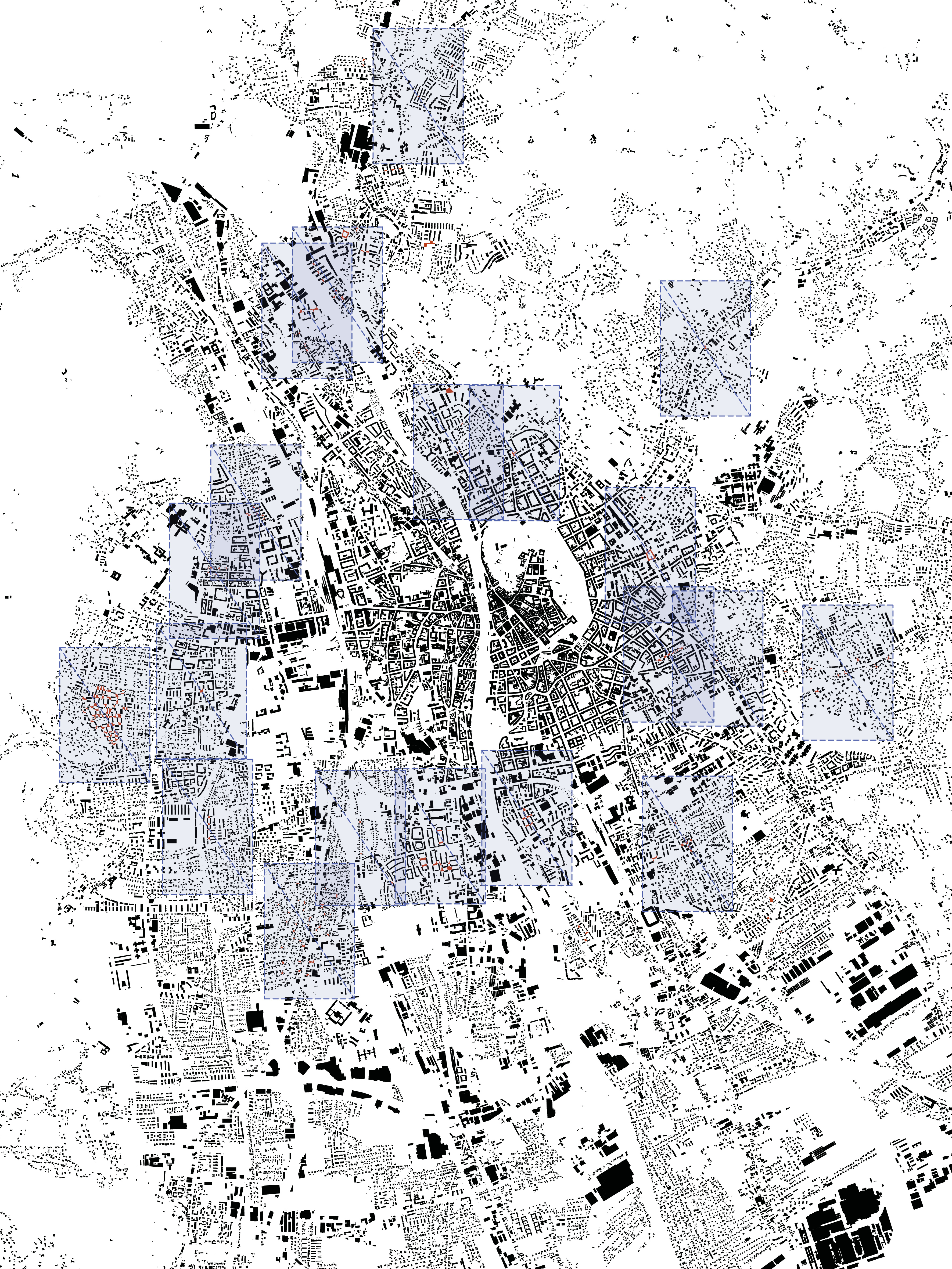 Betrachtet man die Zwischenhäuser im Schwarzplan, verändert sich das Erscheinungsbild der vormals solitären Bauten. Aus losen Objekten im Feld wird ein durchgehendes Gefüge.