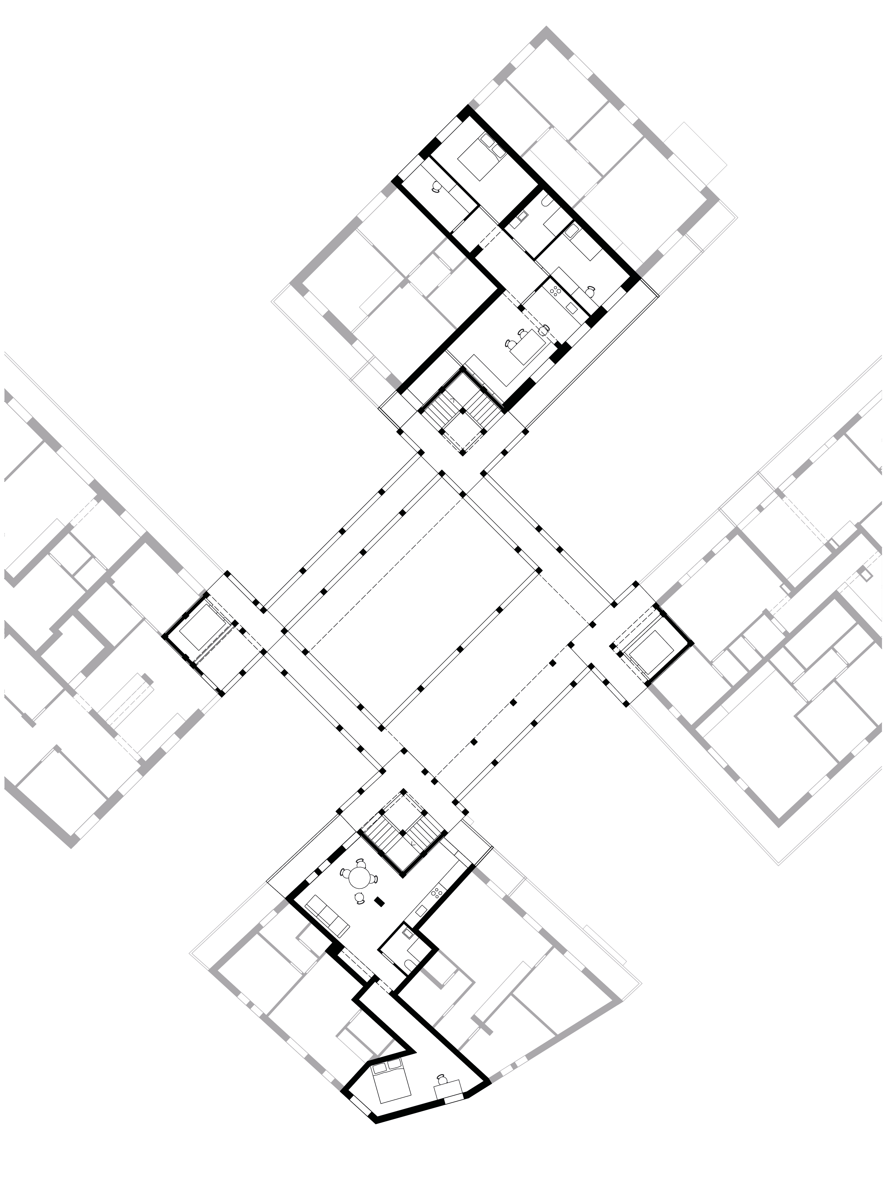Ausgangspunkt ist immer das Eck. Daraus wächst die Wohnung, das Zwischenhaus. Das einstige Außeneck wird zu zwei Innenecken des Außenraums.